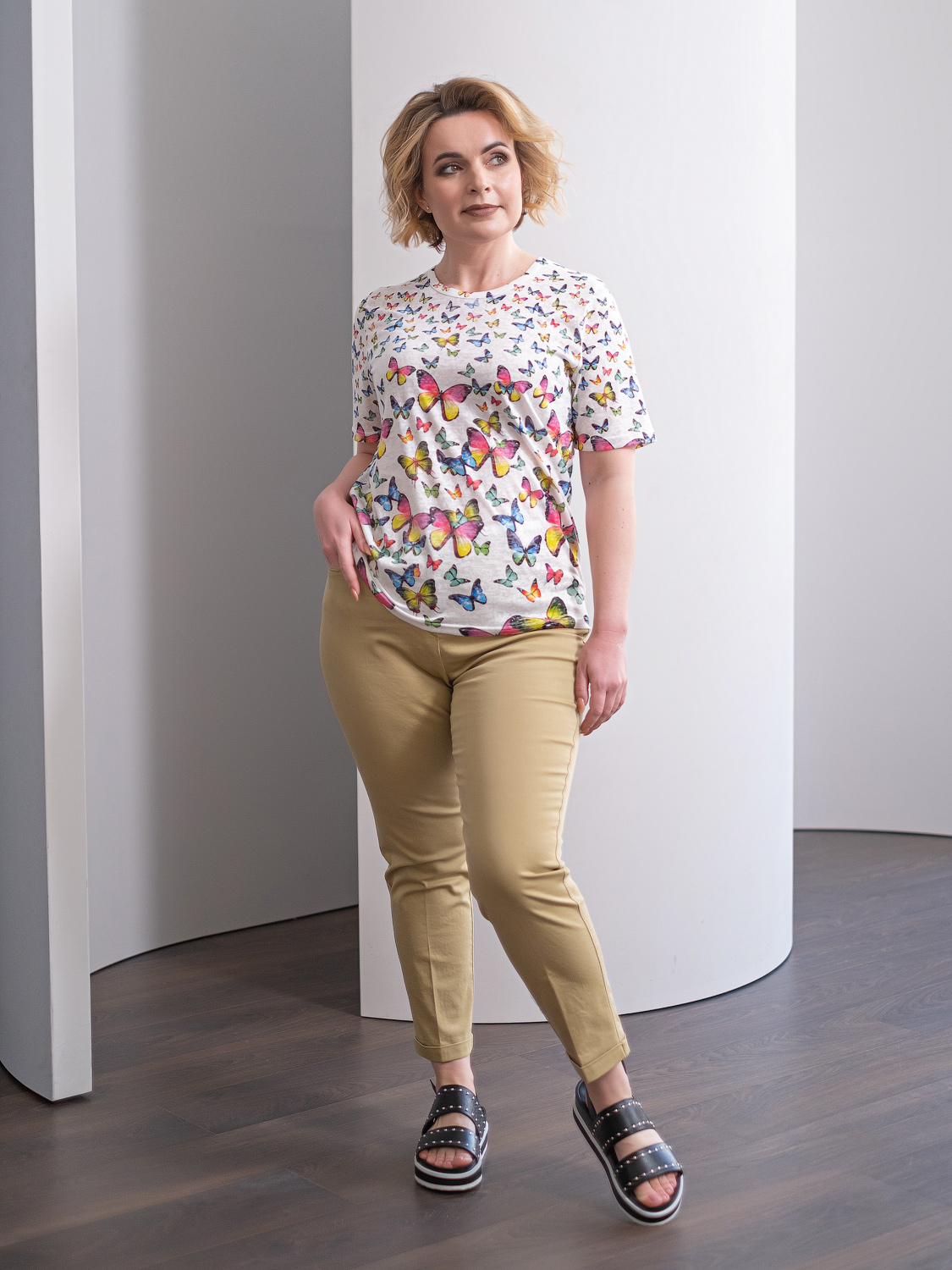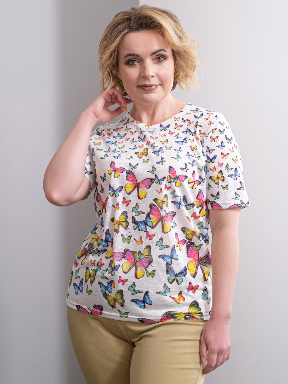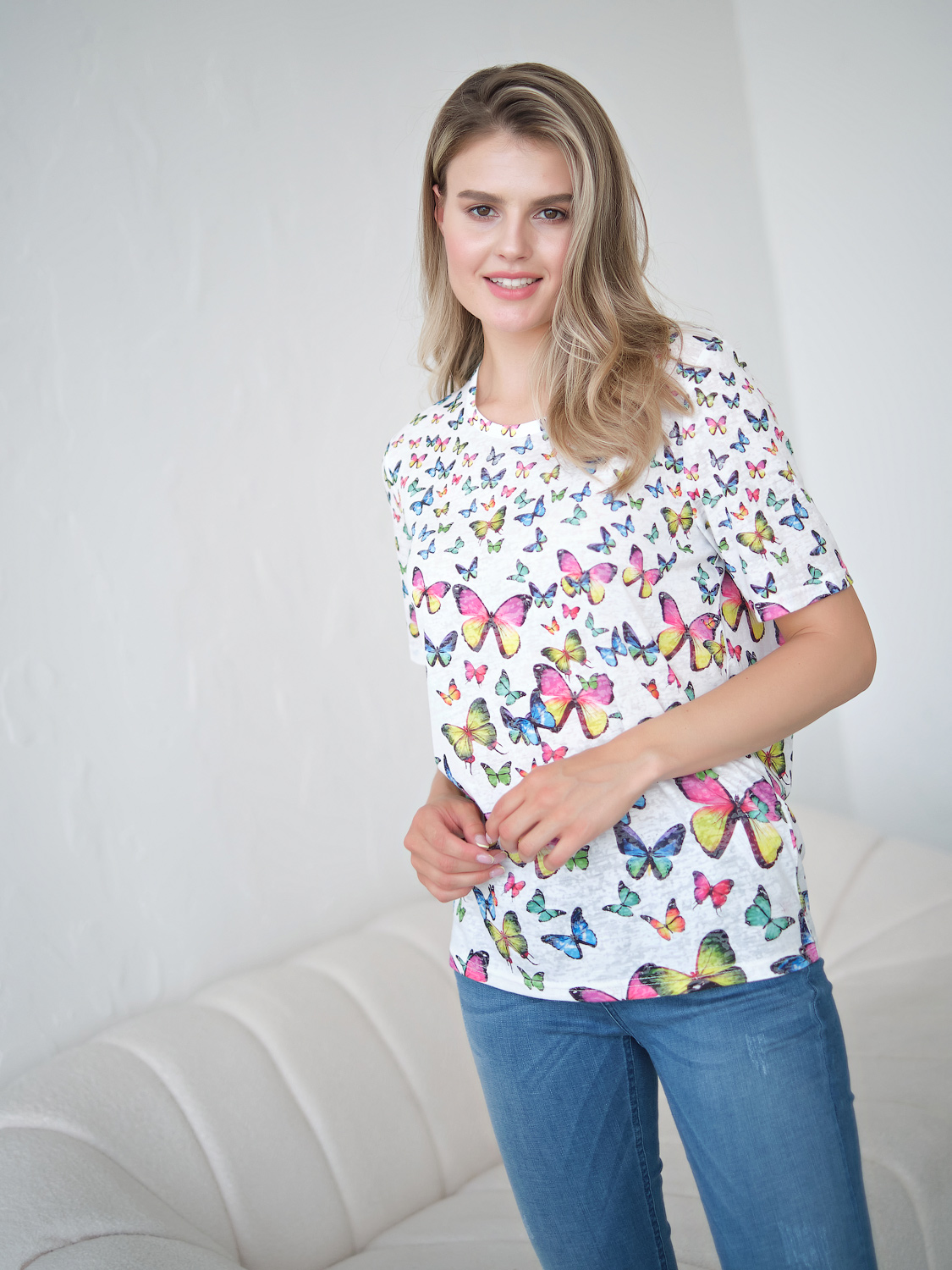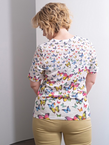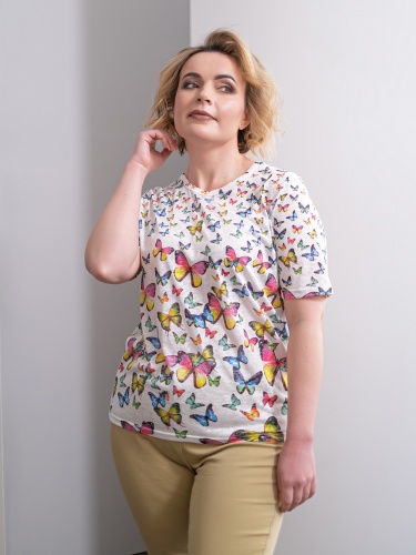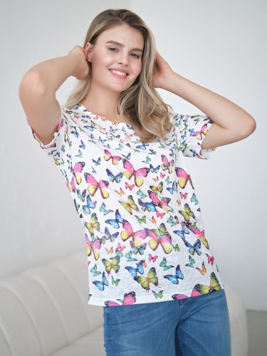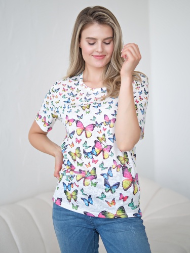 Футболка из легкой полупрозрачной ткани прекрасно подойдет для теплой погоды. Принт с бабочками создаст игривое настроение. Прямой крой скрывает недостатки фигуры и придает легкость силуэту. Короткий втачной рукав позволяет оголить руки и визуально стройнит. Круглый вырез горловины подчеркивает изящество линии шеи.