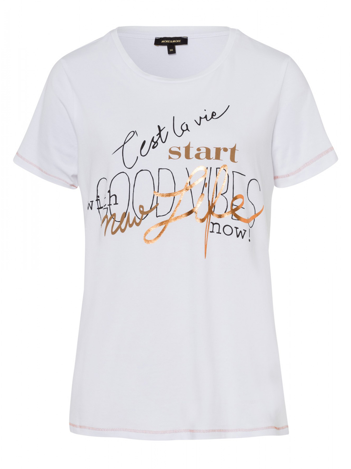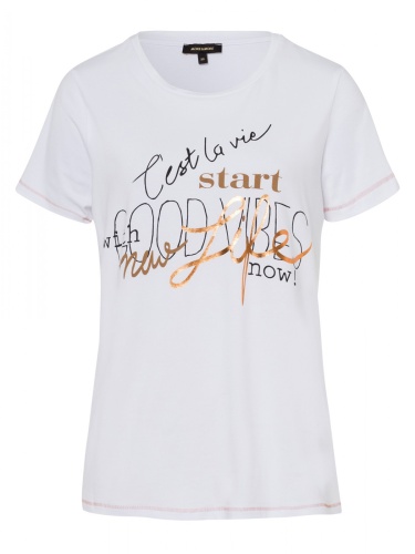 Белая футболка с принтом – базовый атрибут капсульного гардероба любой современной женщины. Cостав материала из смесового хлопка приятен к телу и обеспечивает комфортное ношение. Футболку можно носить навыпуск или заправлять в брюки или юбку.