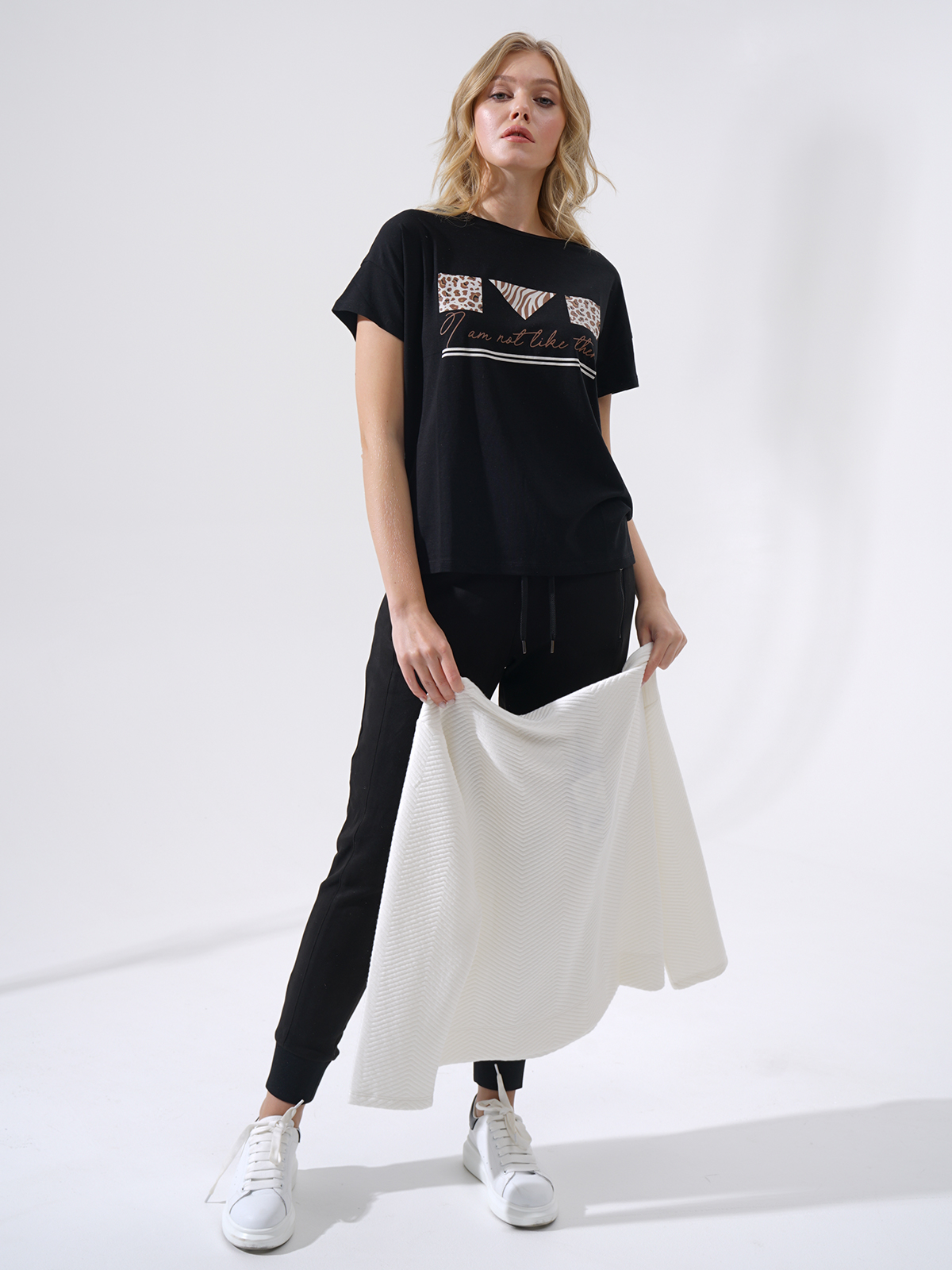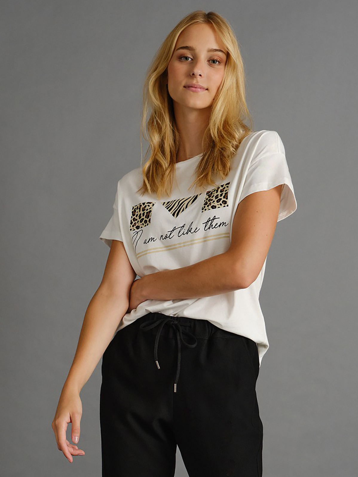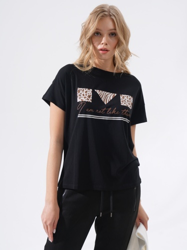 Однотонная футболка с принтом – базовый атрибут капсульного гардероба любой современной женщины. Cостав материала из смесового хлопка приятен к телу и обеспечивает комфортное ношение. Футболку можно носить навыпуск или заправлять в брюки или юбку.