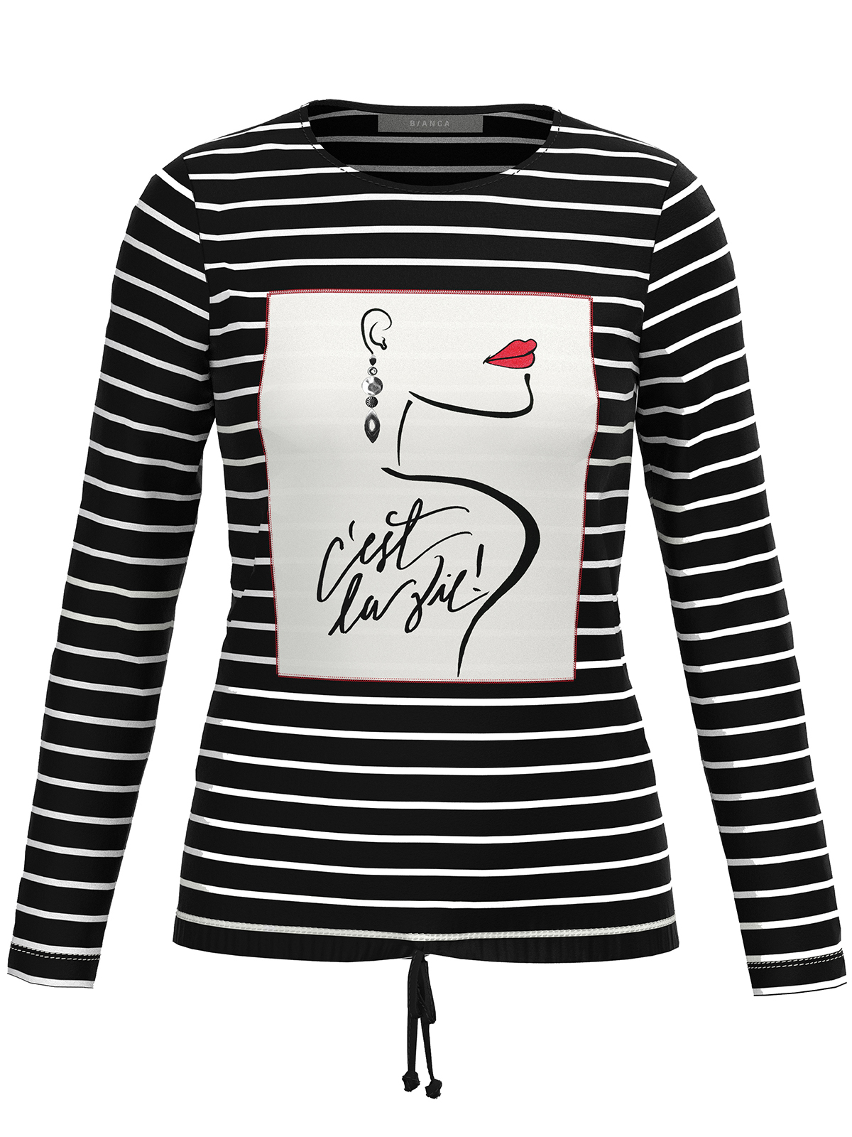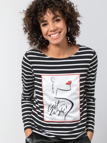 Футболка прямого кроя с длинным рукавом в узкую полоску. Прямой крой. Стильный fashion-принт на груди. Широкий овальный вырез горловины, длинный втачной рукав.