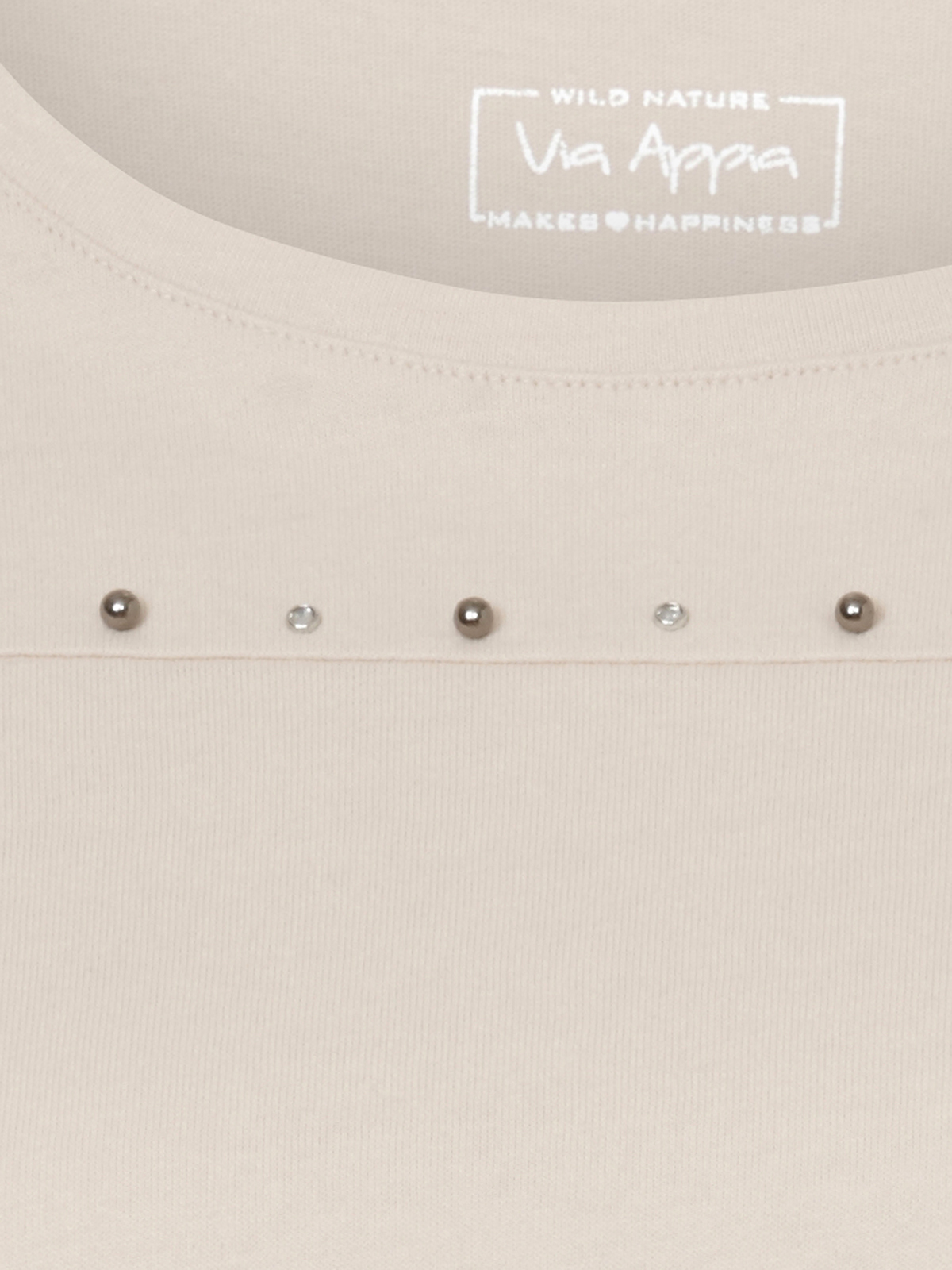 Бежевая хлопковая футболка с рукавом 3/4. Базовый элемент гардероба любой женщины. Футболка универсальна, может выступать как самостоятельный верх или надеваться под жакет , кардиган или блейзер. Натуральный материал приятен к телу и комфортен в ношении. Круглый вырез горловины, втачной рукав. Футболка декорирована бусинами на груди.