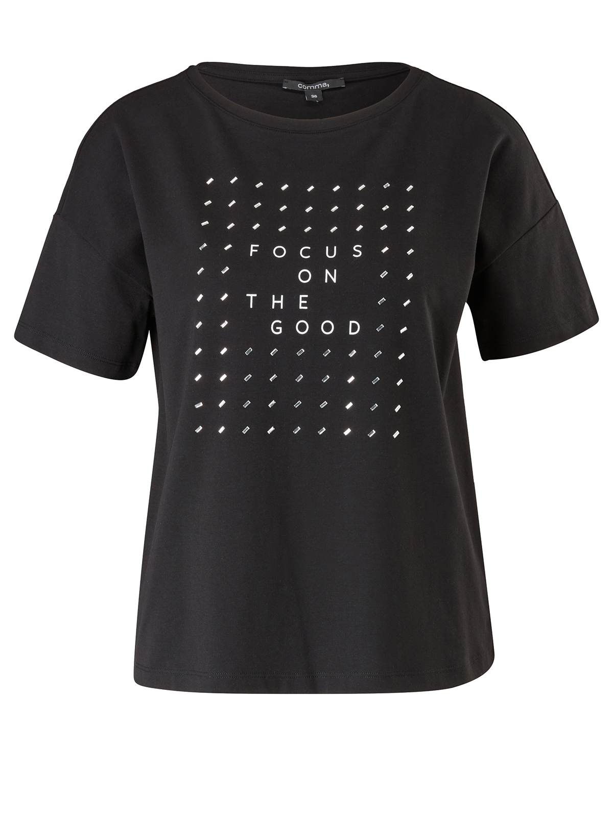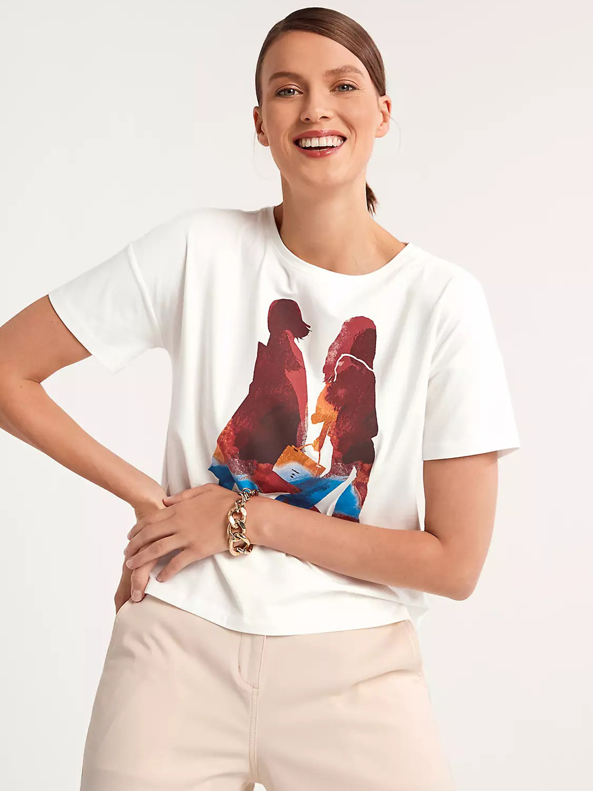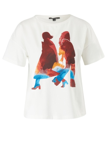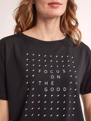 Однотонная футболка с принтом на груди. Материал из смесового хлопка обеспечивает хорошую посадку изделия по фигуре. Круглый вырез горловины, короткий втачной рукав.