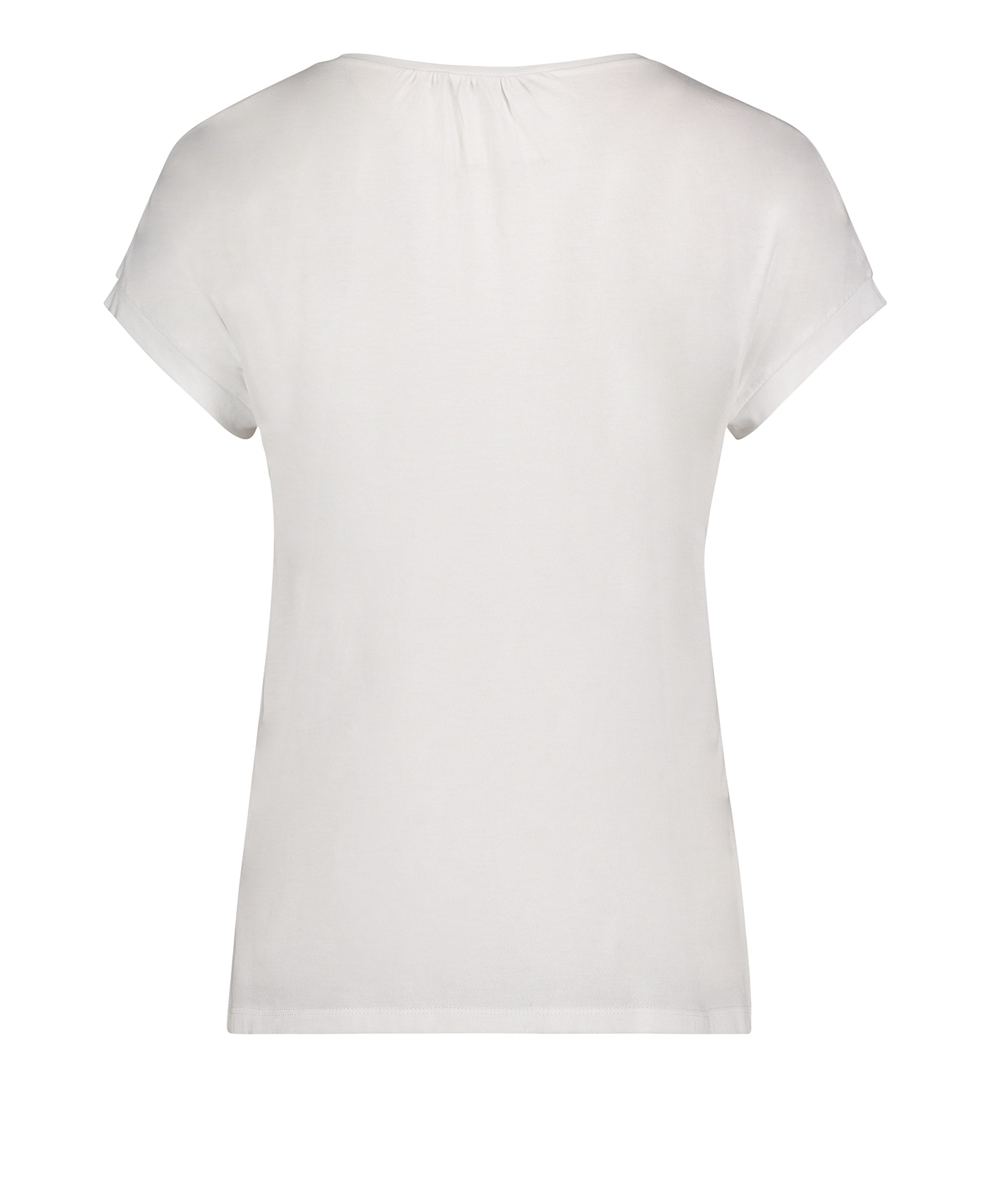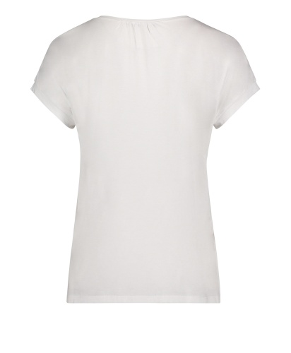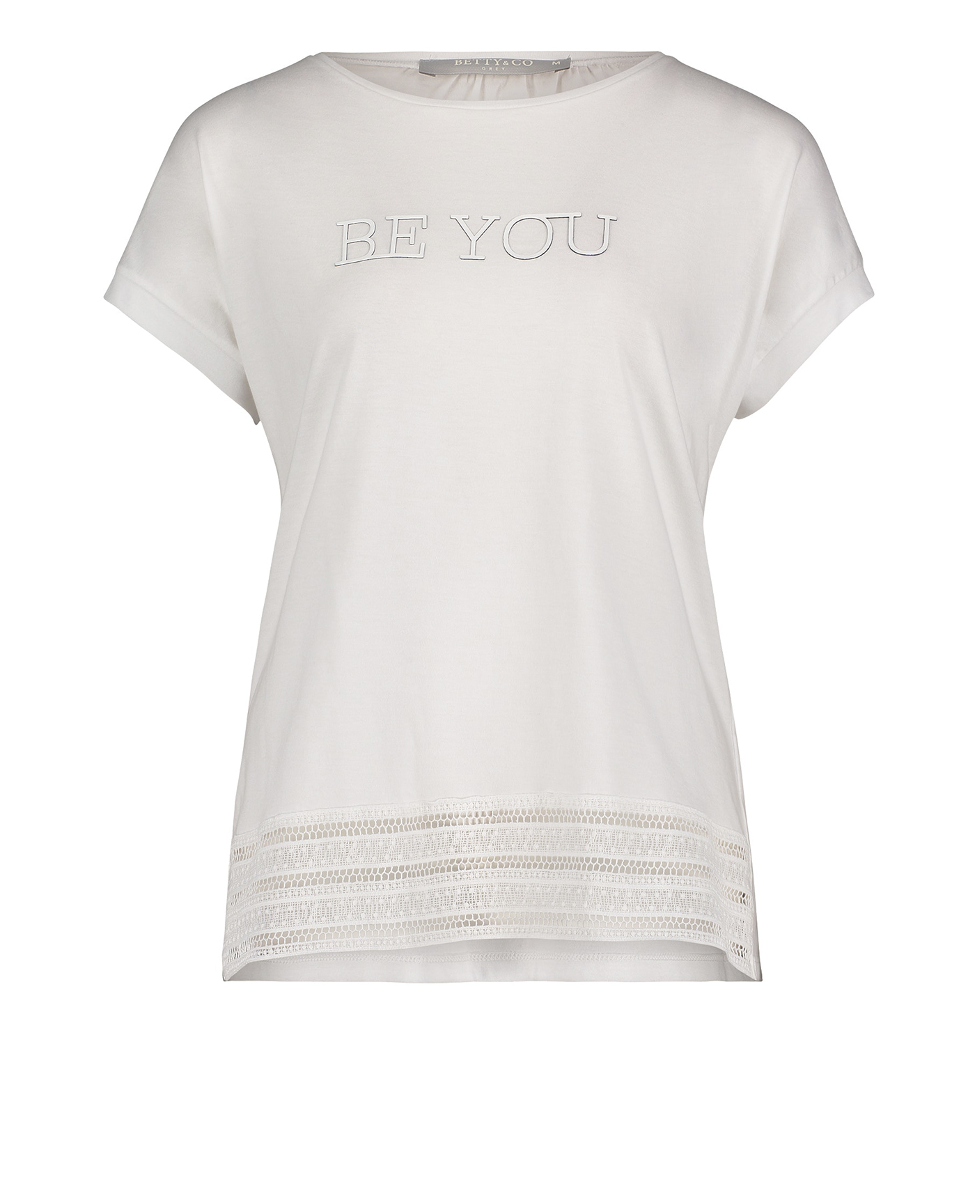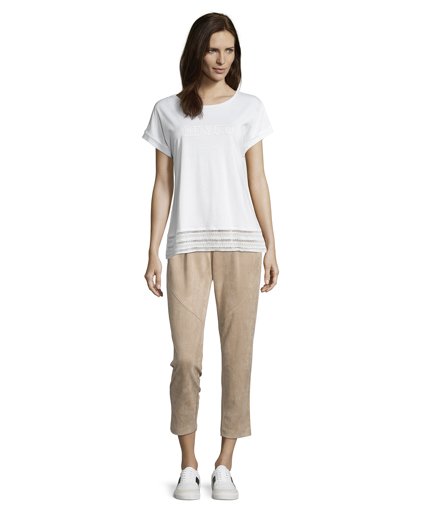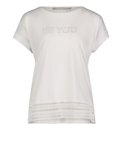 Футболка свободного покроя. Широкая круглая горловина, короткие цельнокроеные рукава. Вышивка с надписью на груди, ажурная отделка по низу. Материал из смеси модала и хлопка приятен к телу и обеспечивает комфорт. Эта модель создает легкий и романтичный образ даже в брючном комплекте.