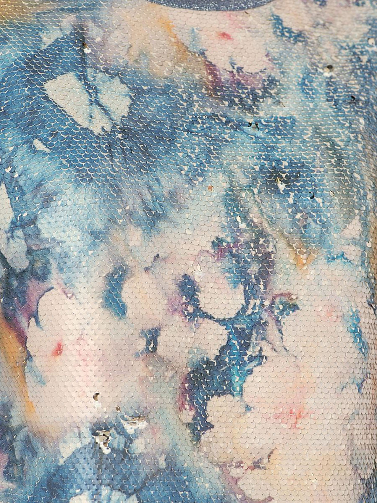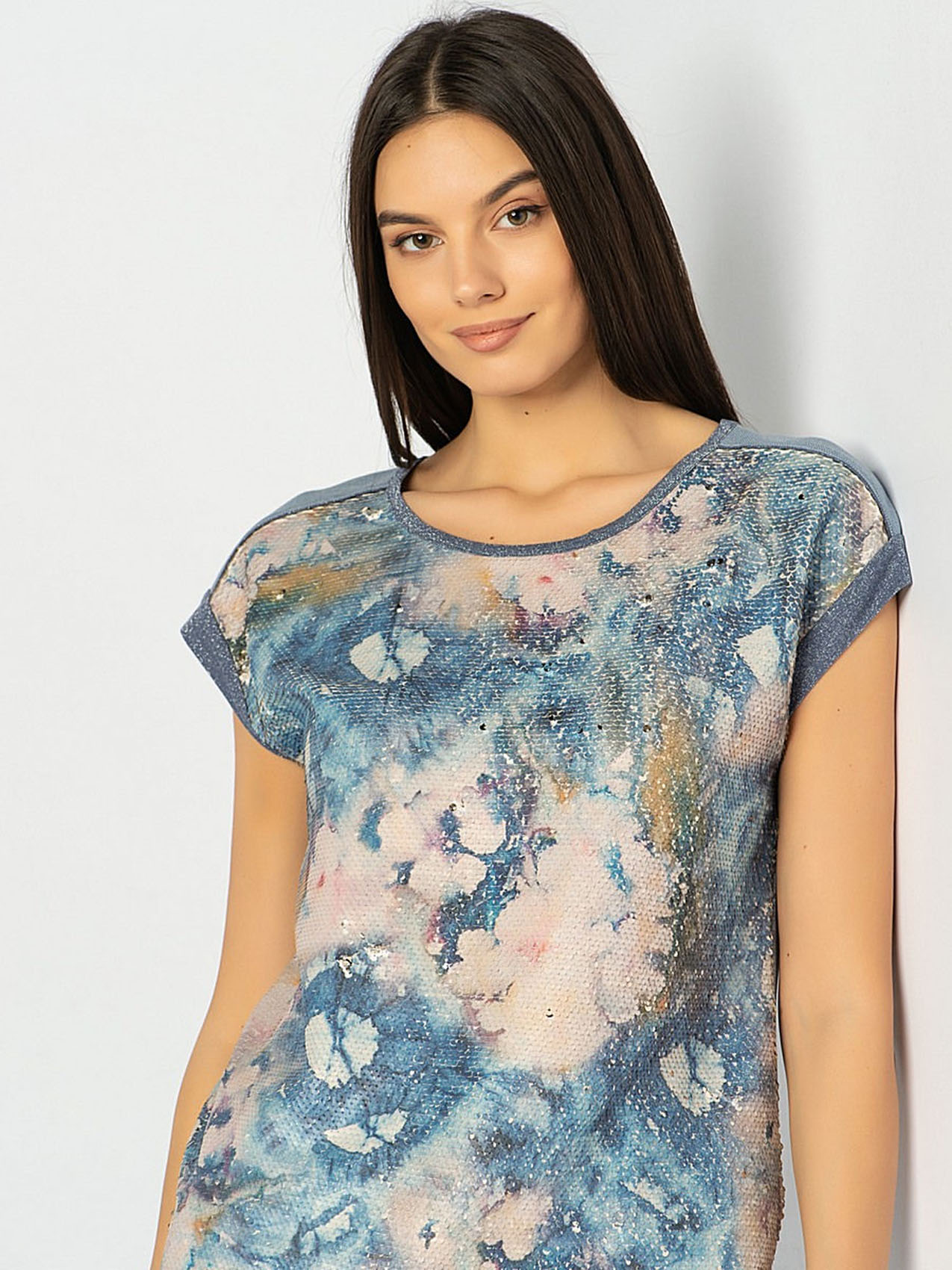 Футболка слегка приталенного силуэта. Декор пайетками по переду изделия, отделка с нитью люрекса. Короткий цельнокроеный рукав. Приятный к телу материал из смеси хлопка и эластана. Длина изделия по спинке: 65 см.