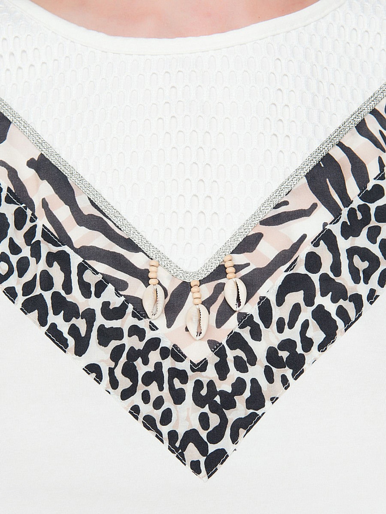 Белая футболка полуприлегающего силуэта совсем не выглядит скучно! А все благодаря декору, который сочетает в себе ракушки, звериный принт и ажурные элементы.