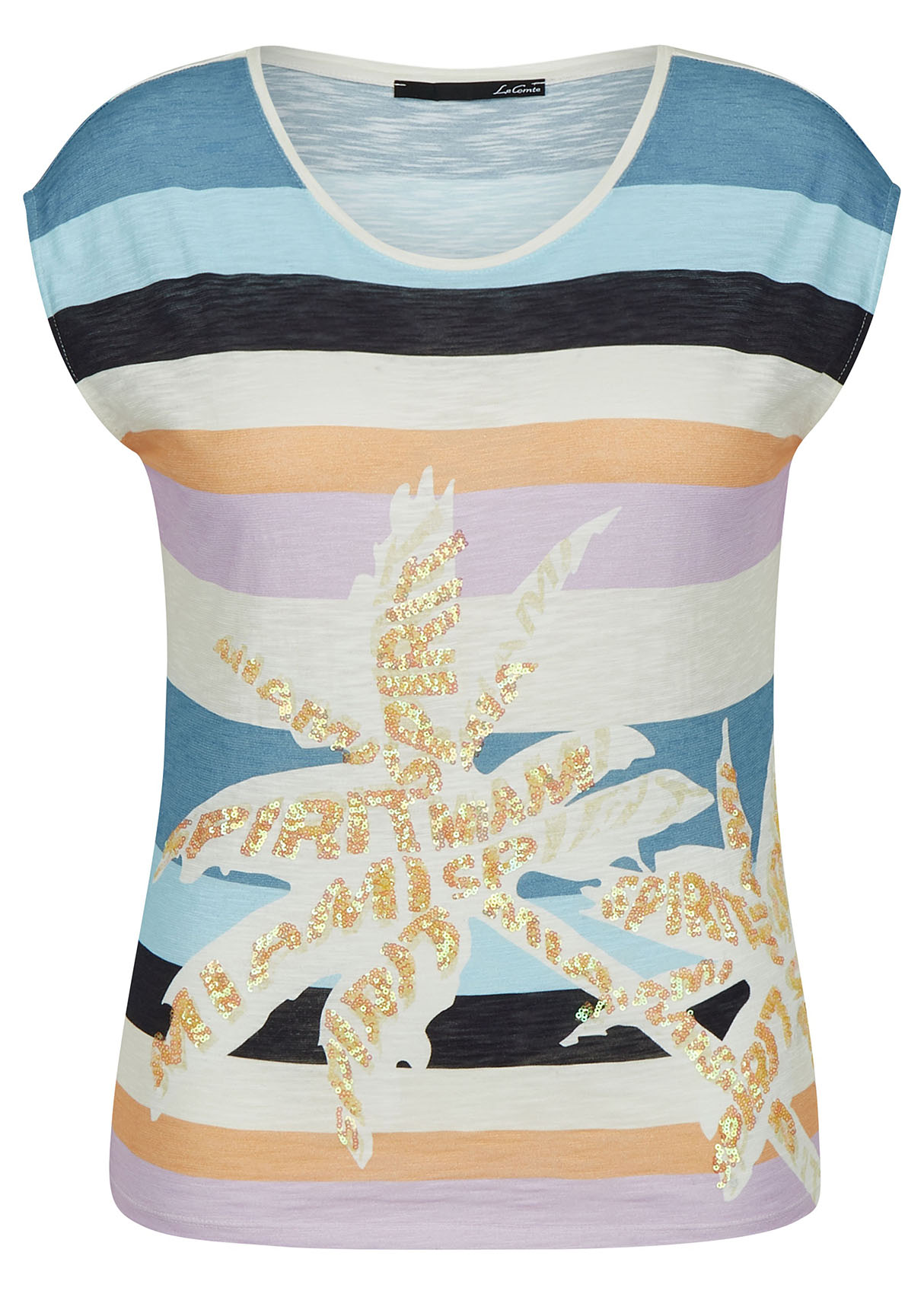 Футболка слегка приталенного силуэта. Круглый вырез, короткие цельнокроеные рукава, небольшие разрезы по бокам. Трендовая полоска. Декор: вышивка пайетками.