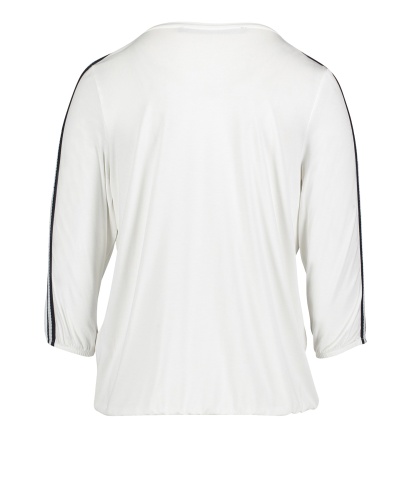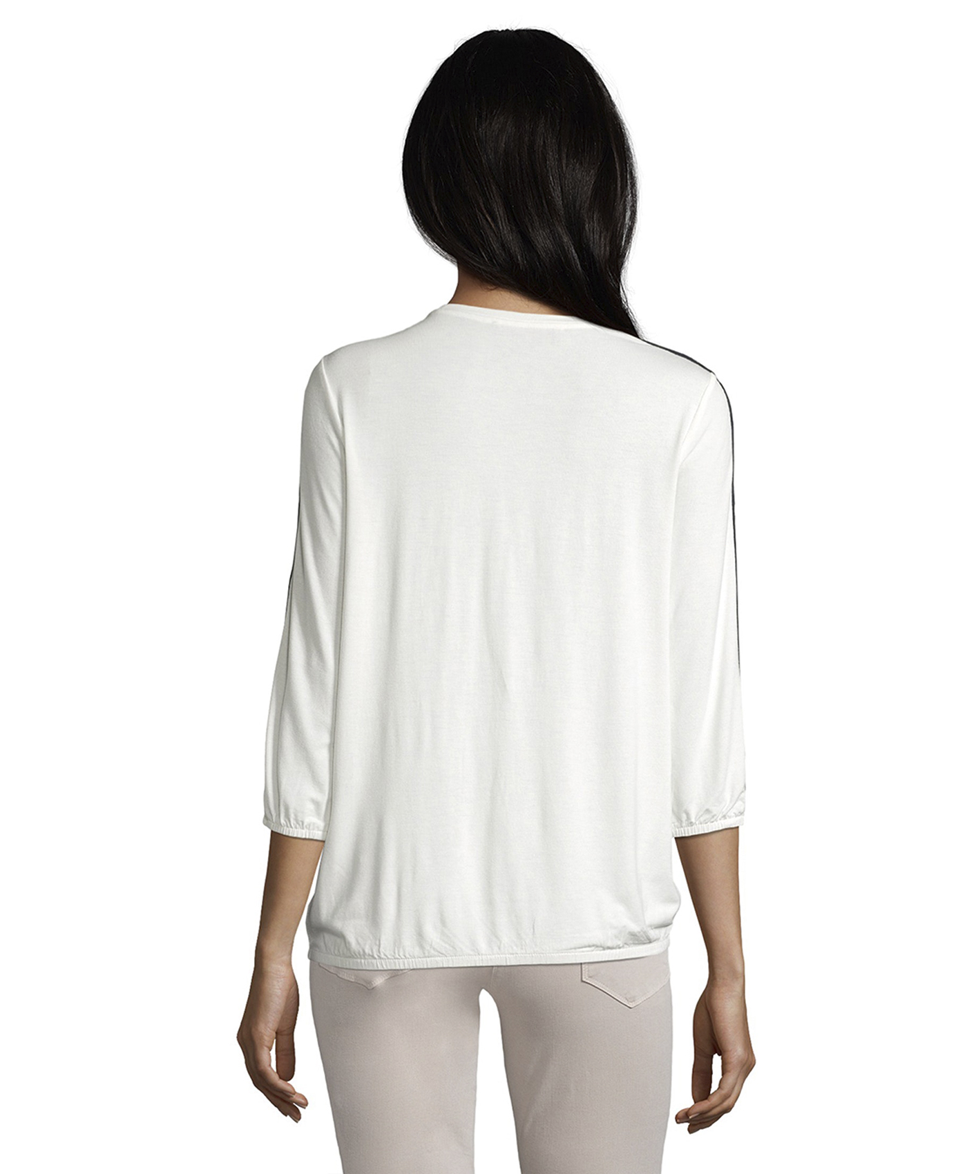 Свобода в тренде! Футболка свободного покроя. Круглый вырез горловины. Рукава 3/4 украшены тесьмой. Декор стразами придает образу нотку гламура. Материал из вискозной смеси приятен к телу и обеспечивает комфорт. Эта футболка станет изюминкой множества образов в стиле кэжуал.
