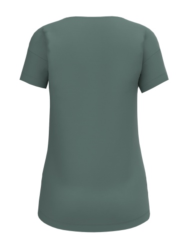 Футболка с геометрическим абстрактным узором на переде изделия выполнена в зеленых оттенках. Короткий втачной рукав, спущенная линия плеч. Широкий овальный вырез горловины.