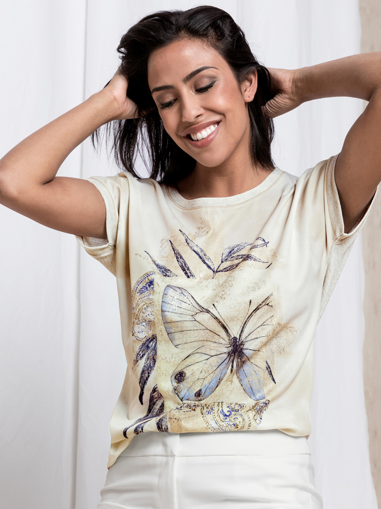 Футболка в нежном нюдовом оттенке с романтичным принтом спереди. Короткий цельнокроеный рукав с подворотом, круглый вырез горловины.