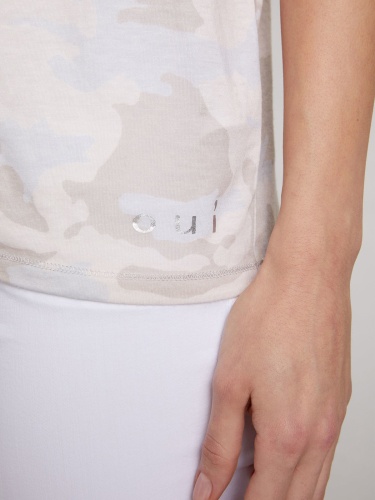 Футболка в нежной расцветке может быть самостоятельным верхом или надеваться под блейзер или жакет. Короткий втачной рукав, V-образный вырез горловины.