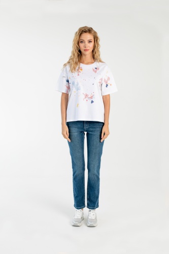 На сайте указаны российские размеры. Ткань: выполнена из 100% гладкого хлопка высокого качества. Крой: модель прямого силуэта с разным уровнем длины: спинка чуть длиннее переда. Имеет круглый вырез и втачной рукав-реглан. Разрезы по бокам добавляют комфорта при движении, а средняя длина располагает к активной деятельности – футболка не будет подниматься вверх. Отделка: абстрактный рисунок по корпусу и рукавам – символ того, что художник есть в каждом из нас. Только позвольте своему таланту развиться! Сочетается с брюками, джинсами, юбками и шортами из ассортимента Stern.