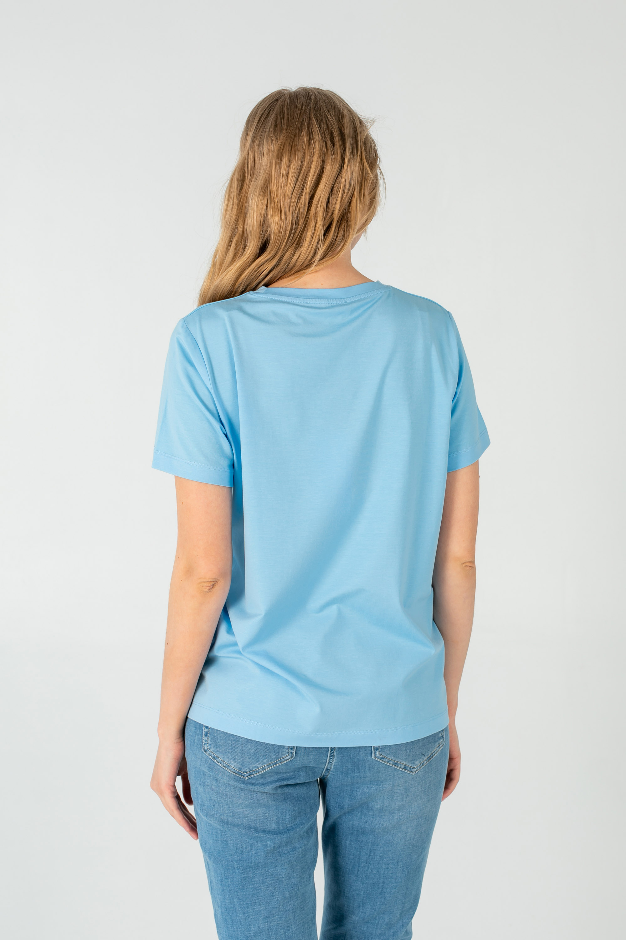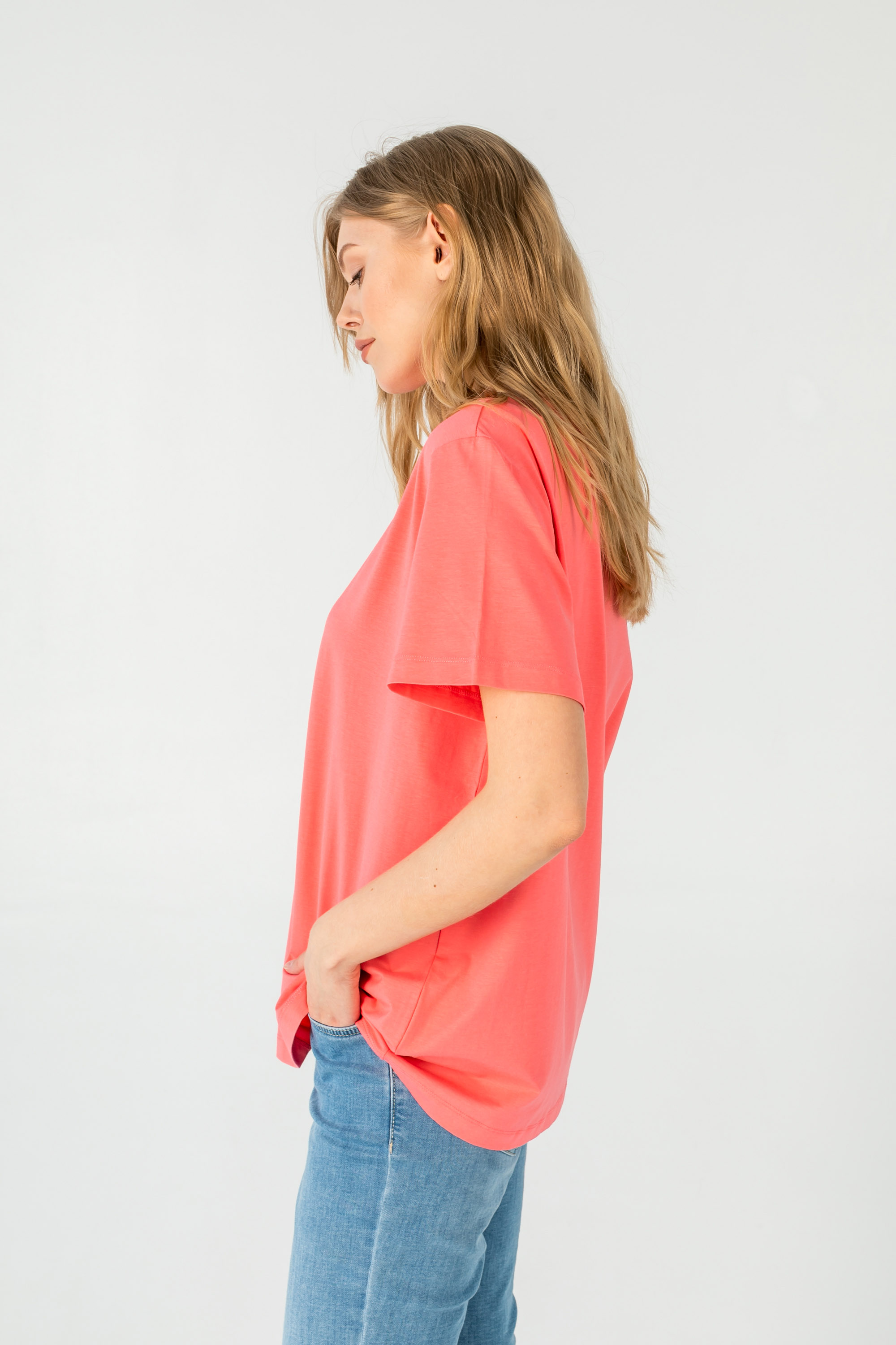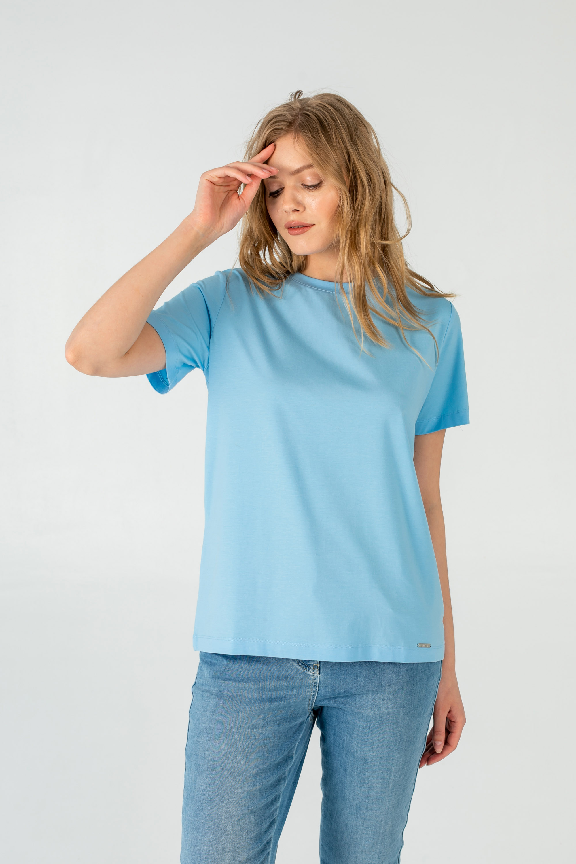 На сайте указаны российские размеры. Ткань: материал из смеси хлопка (49%), вискозы (46%) и эластана (5%) Крой: однотонная базовая футболка прямого силуэта средней длины. Имеет круглый вырез и свободный короткий рукав-реглан. Подходит под разные типы фигур. Отделка: украшена фирменным шильдиком с надписью Stern. Идеальная базовая футболка, которая станет самостоятельным элементом или первым слоем для жакетов, рубашек, джемперов и кардиганов.