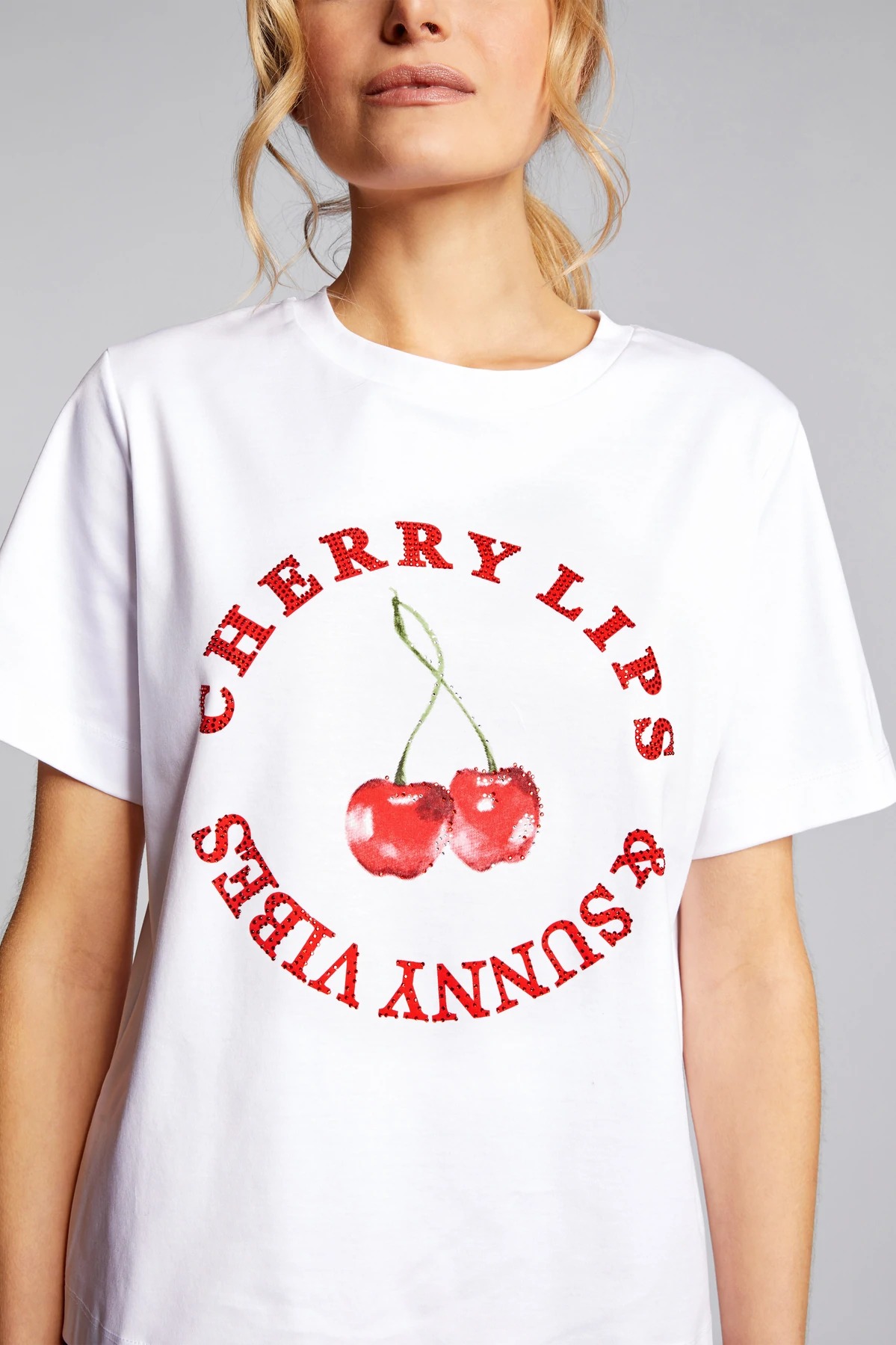 Футболка прямого силуэта с надписью и деталями со стразами.