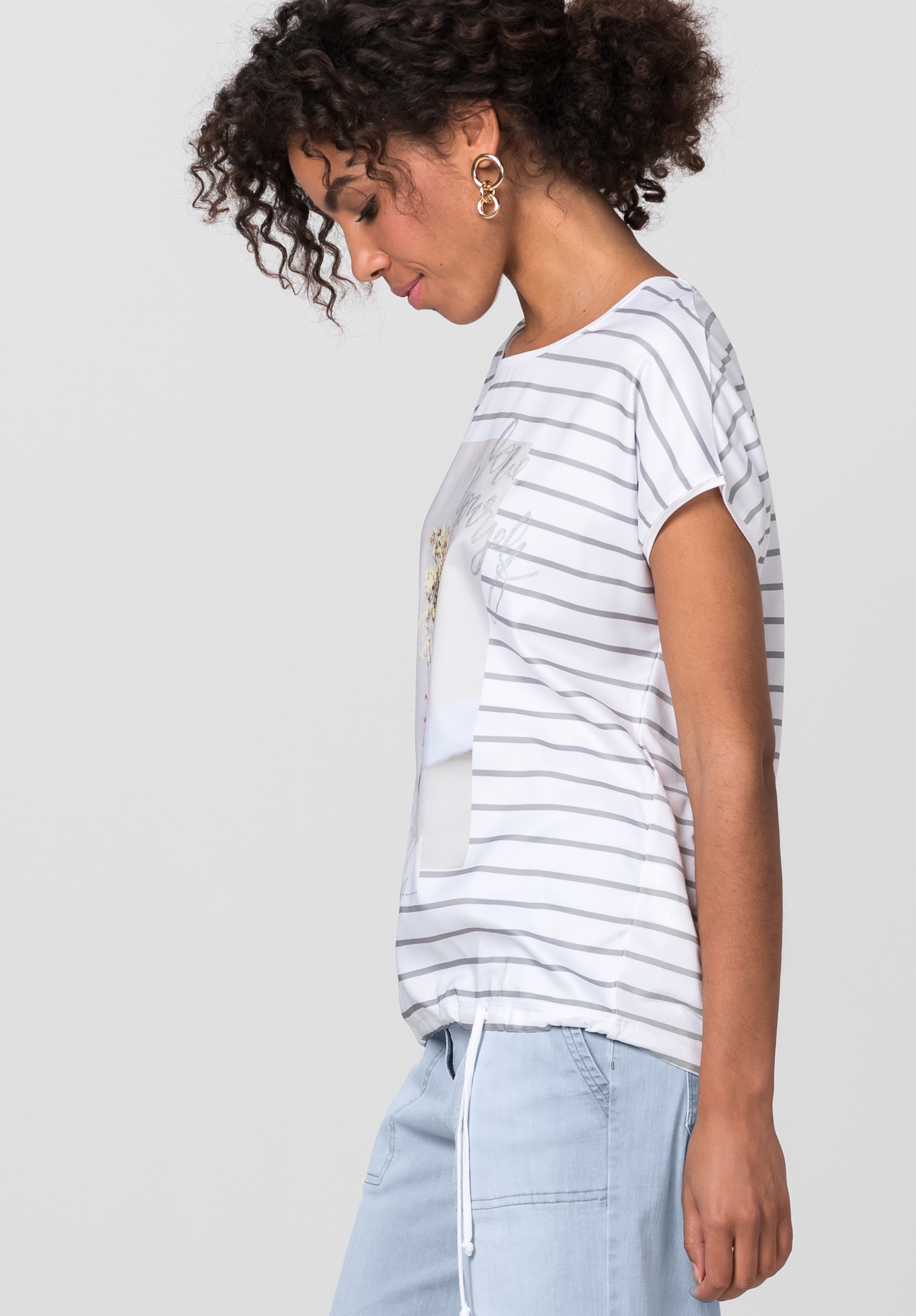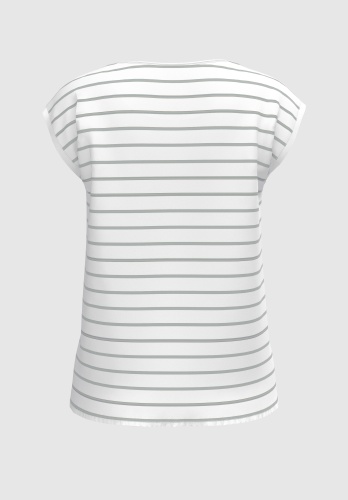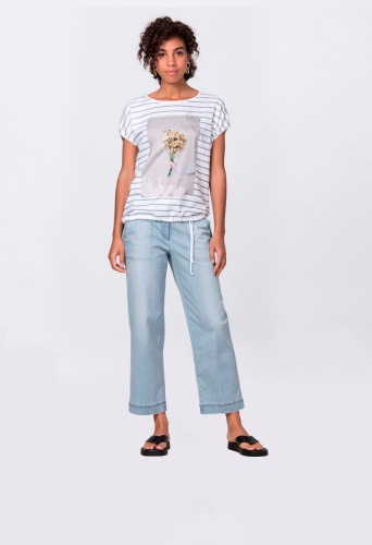 Футболка с принтом, круглым вырезом и объемными рукавами. Атласная отделка спереди, трикотаж сзади. Кулиска с завязками на кромке.