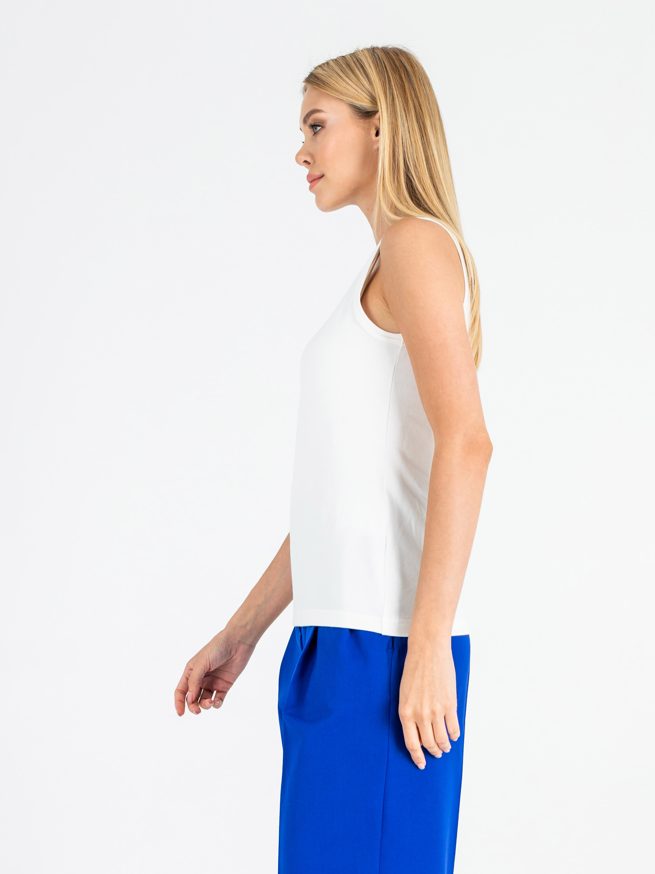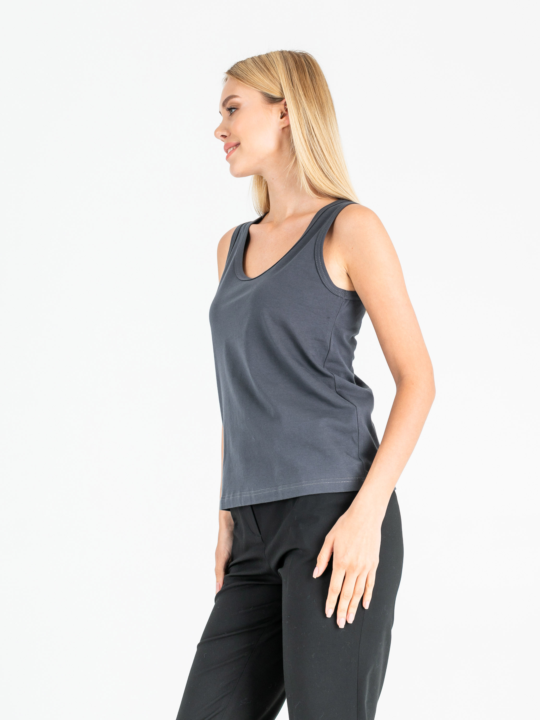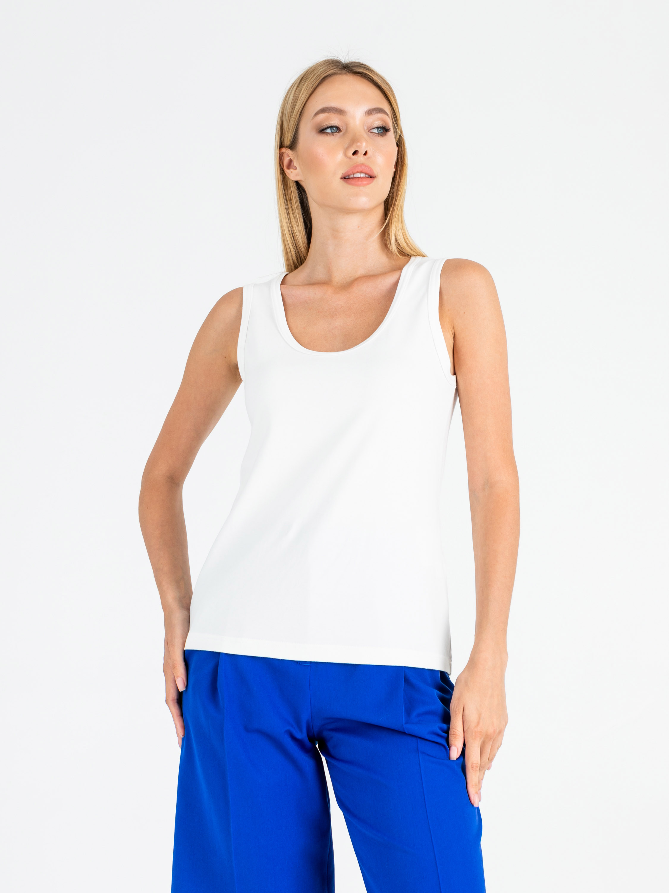 Классический слегка приталенный топ на широких лямках. Параметры модели: 86-61-91 см Рост 177 см