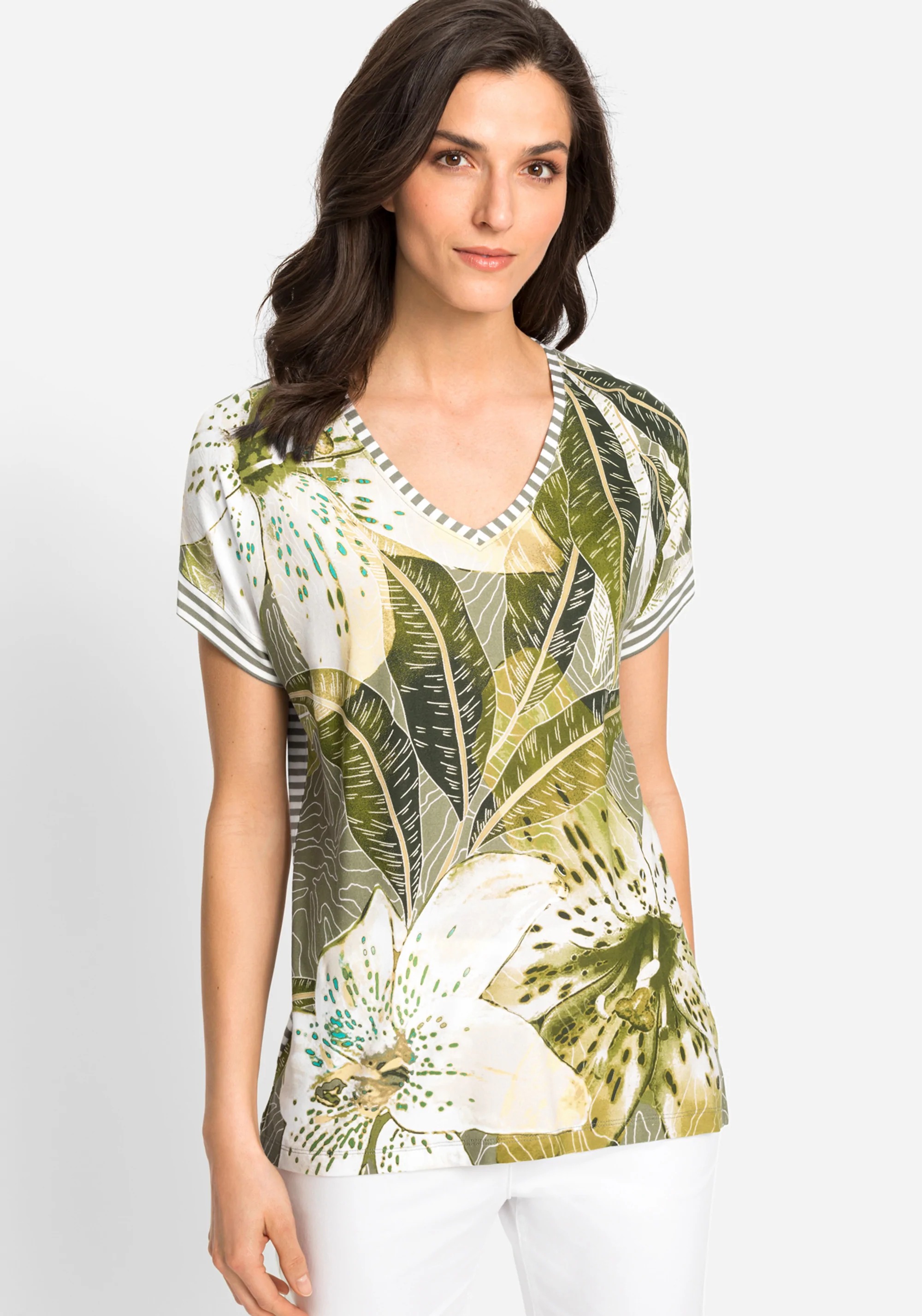 На сайте указаны российские размеры. Эта футболка - красивое сочетание сплошного цветочного принта спереди и классического полосатого узора сзади. Слегка закругленный V-образный вырез и манжеты, красиво подчеркнутые полосками. Рубашка немного длиннее сзади, чем спереди, создает красивую струящуюся драпировку и имеет облегающий крой. Бонус: он изготовлен из экологически чистого вискозного волокна ECOVERO™, созданного из древесины местного, контролируемого и органического выращивания.