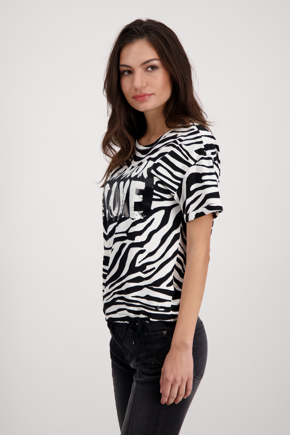 На сайте указаны российские размеры. Модная трикотажная футболка от monari очень удобна в носке благодаря струящемуся качеству из вискозы и модала. Модель с короткими рукавами имеет классический крой, круглый вырез горловины с планкой и блестящим оверлочным швом с люрексом, слегка приспущенные плечи и подол с кулиской и завязкой. Тигровый принт украшен гламурными лакированными буквами с блестящими деталями спереди и придает модели с изображением животных женственный оттенок. Смотрите сами. Модель ростом 179 см Длина платья 62 см