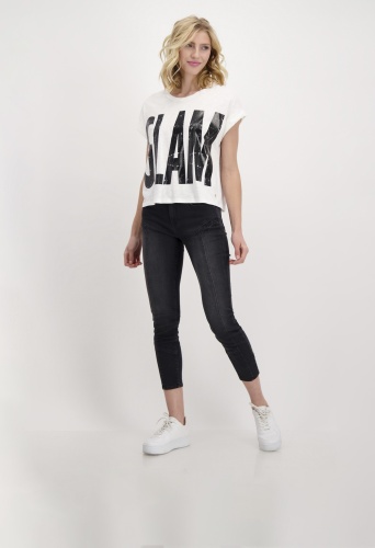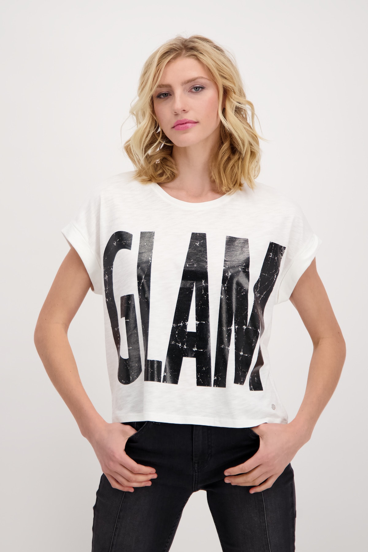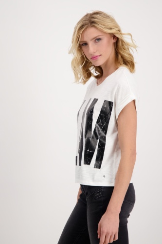 На сайте указаны российские размеры. Рубашка из тонкой пряжи с круглым вырезом и крупным принтом. Крупная виниловая надпись на джерси из тонкой пряжи придает рубашке с круглым вырезом выразительный вид. Модель ростом 179 см Длина платья 60 см