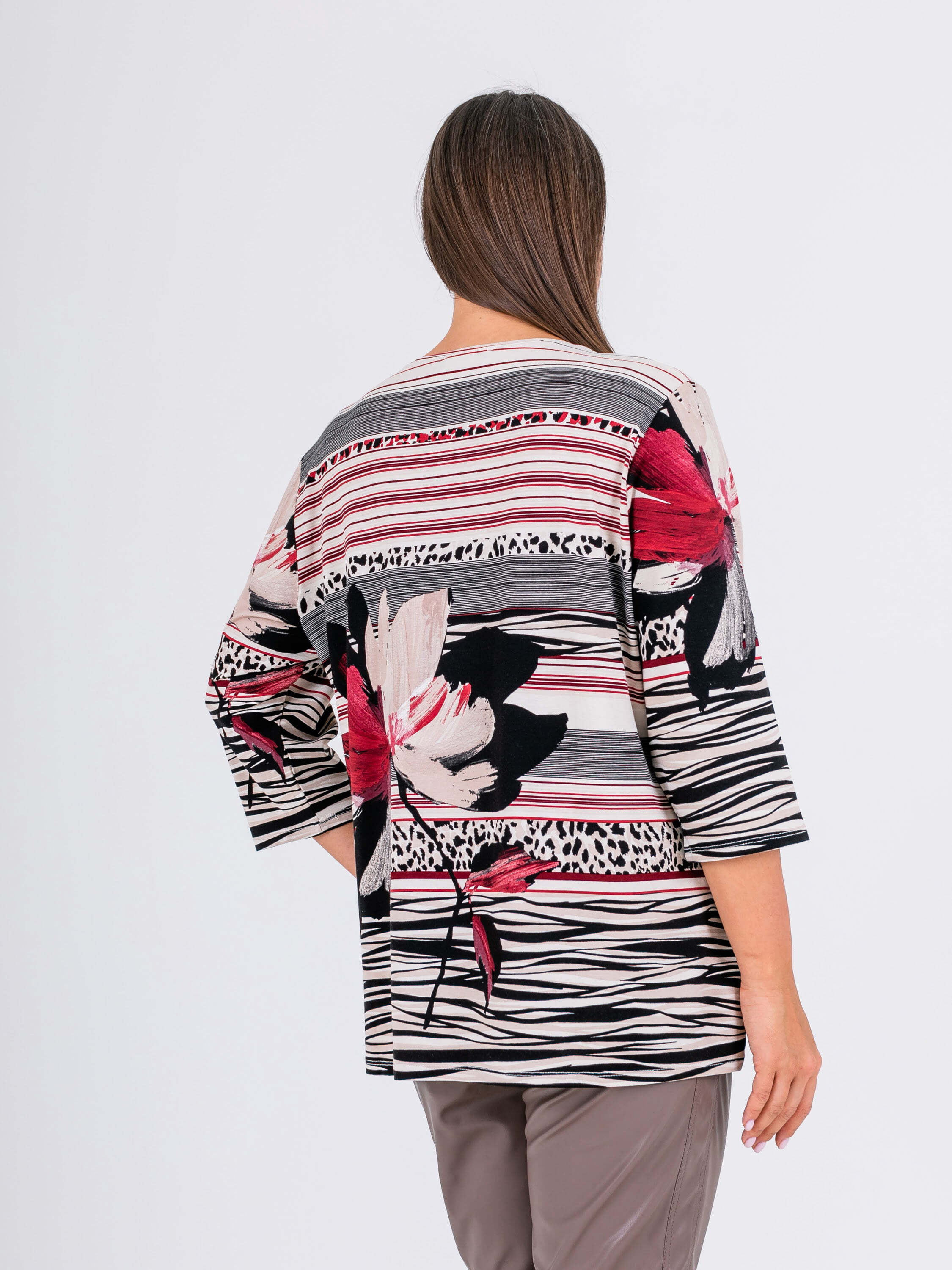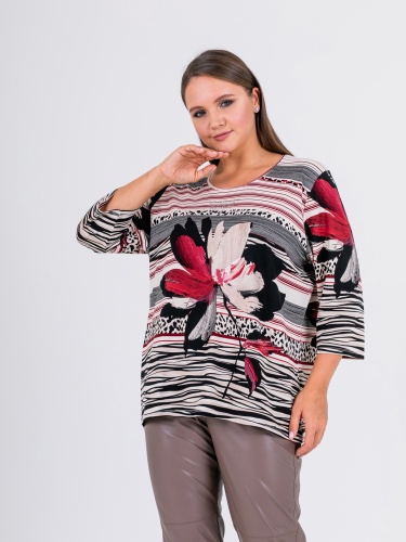 На сайте указаны российские размеры. Ткань: 92% вискоза, 8% эластан. Крой: комфортная модель с рукавами ¾ и круглым горлом. Свободные прямые рукава обеспечивает максимальный комфорт и свободу при движении. Универсальная модель, подходящая женщинам с разным типом фигур, а особенно дамам с пышными формами. Отделка: главное украшение – изображение цветка расположено в двух сторон джемпера. Перед украшен россыпью элегантных страз, которые добавляют блеска и торжественности. Сочетайте с джинсами и кожаными брюками из ассортимента Stern.