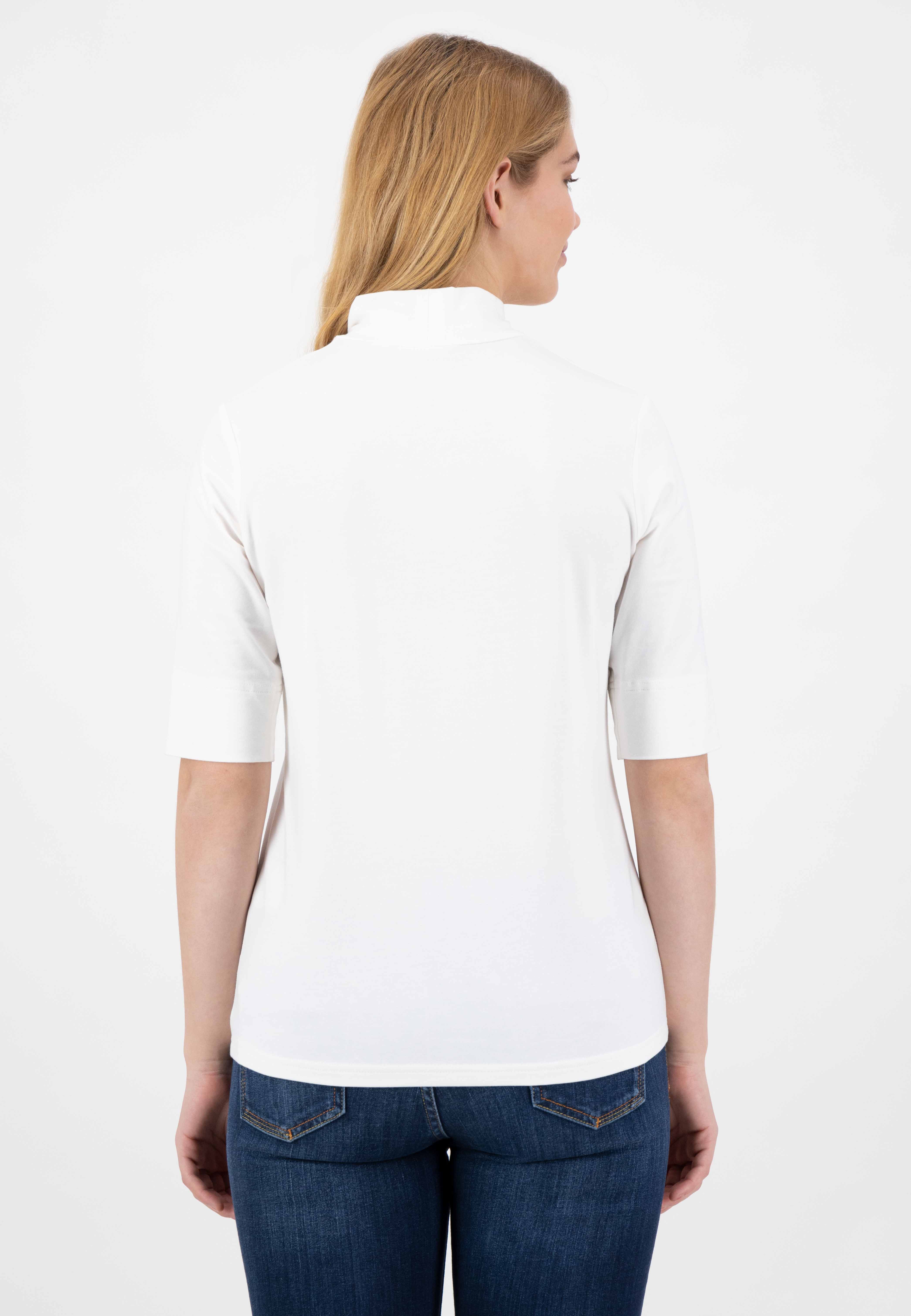 На сайте указаны российские размеры. Белая водолазка с модными короткими рукавами — актуальная комбинация для модных образов осенью и зимой. Рубашку можно носить с повседневным кардиганом или элегантно сочетать со стильным блейзером . Благодаря сочетанию комфортного эластана и высококачественного хлопка приталенная рубашка с короткими рукавами и водолазкой особенно удобна в носке. Кроме того, приталенный крой рубашки с высоким воротником создает красивую фигуру. Особое внимание привлекает маленькое сердечко из сверкающих серебряных стразов на подоле. Наша модель ростом 177 см. Измерения для размера 44: Окружность груди: 92 см Талия: 88 см Бедра: 97 см Длина по спинке: 62 см. Длина рукава: 31 см.