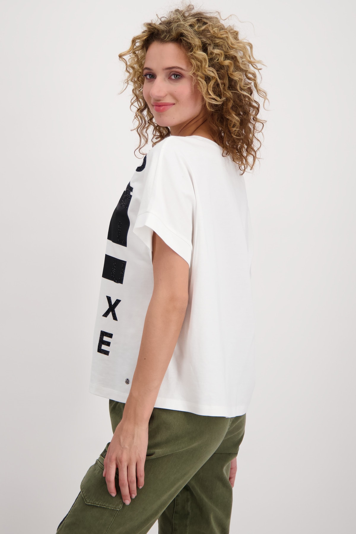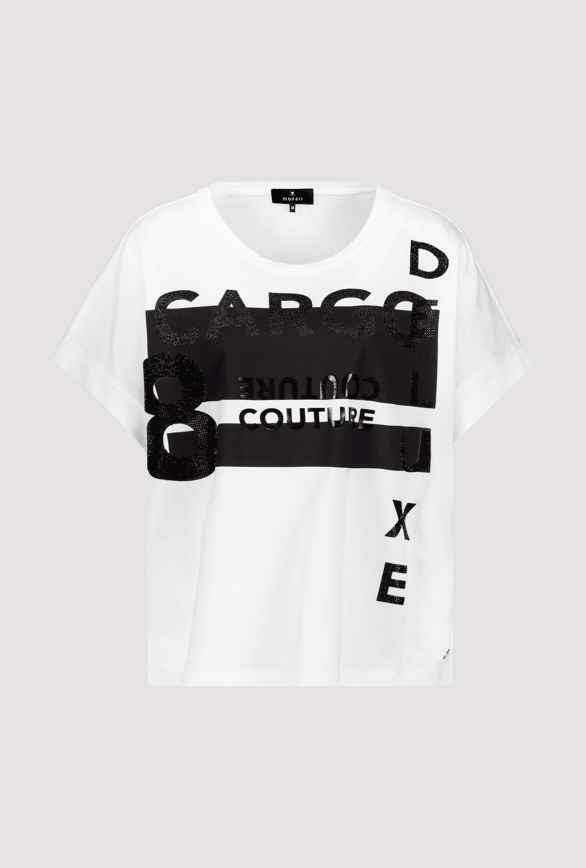 На сайте указаны российские размеры. Футболка из джерси с половиной рукавов, круглым вырезом и принтом. Сочетание контрастных букв из сверкающих стразов, блесток и глянцевого лакированного принта в сочетании с двумя контрастными цветными принтами спереди делает рубашку из джерси monari вашим новым любимым компаньоном. Форма: прямой крой со вставкой и оверлочным швом в тон по круглому вырезу горловины и предполагаемому, накладывающемуся короткому рукаву с манжетами на концах рукавов. Сочетание высококачественного хлопка и модала также гарантирует комфорт в течение всего дня. Модель ростом 176 см. Длина спины 44 размера составляет 62 см.