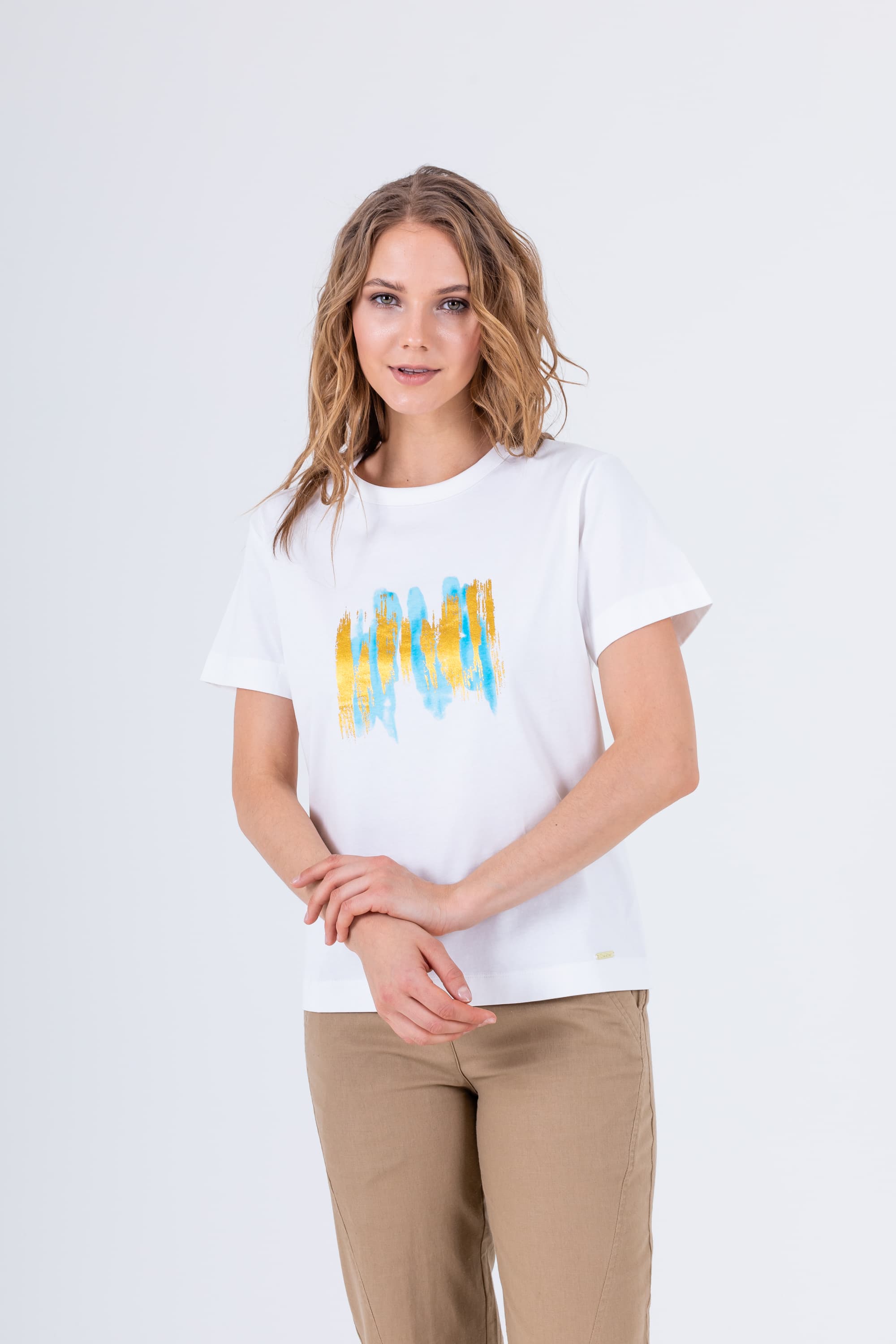 На сайте указаны российские размеры. Футболка средней длины прямого силуэта из легкого 100% хлопка. По переду выполнен яркий принт. Укороченные втачные рукава. Круглый вырез горловины.