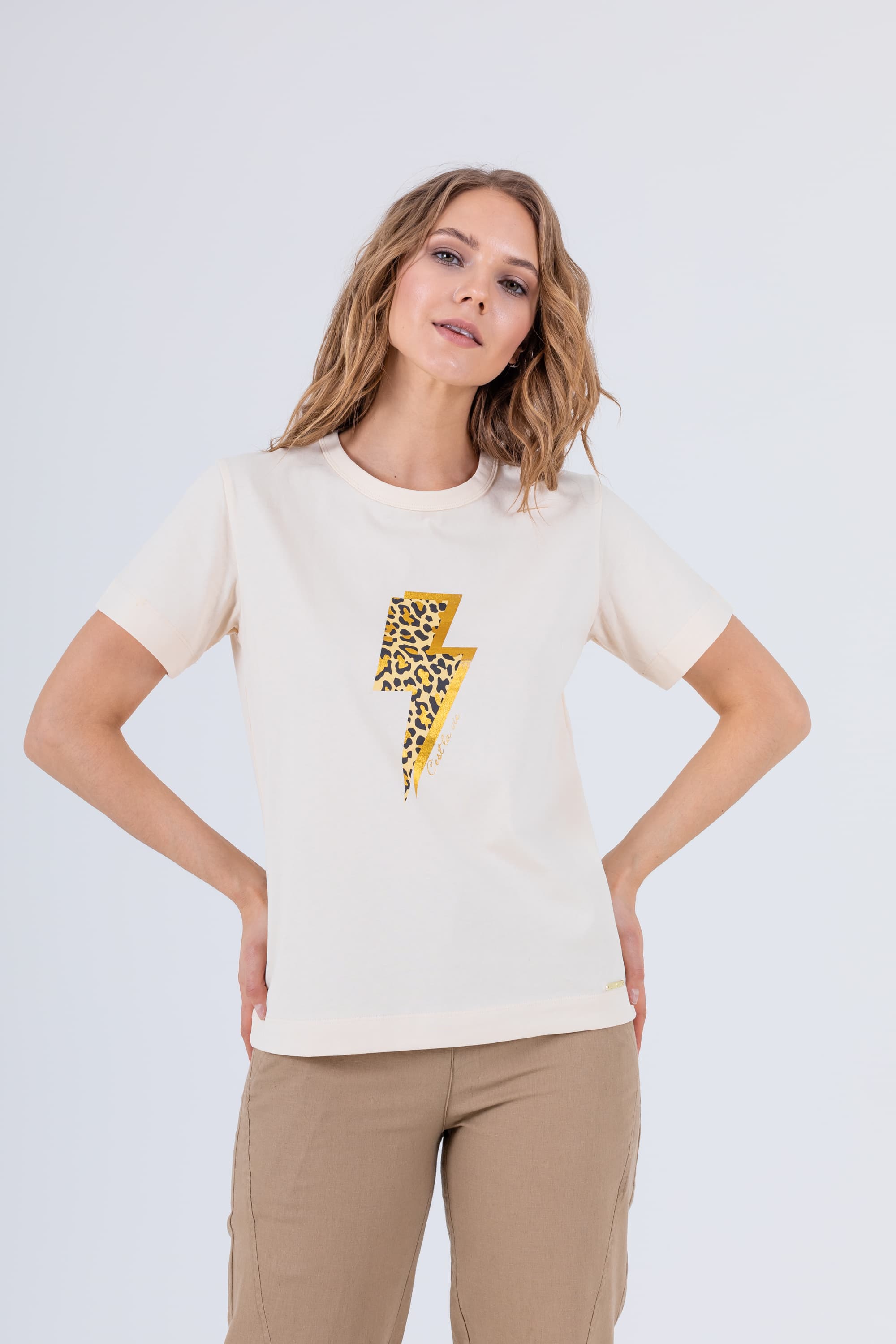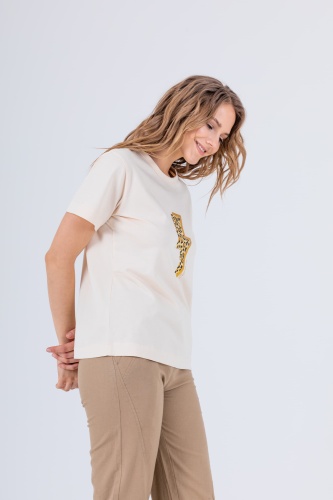 На сайте указаны российские размеры. Футболка средней длины прямого силуэта из легкого 100% хлопка. По переду выполнен яркий леопардовый принт. Укороченные втачные рукава. Круглый вырез горловины.