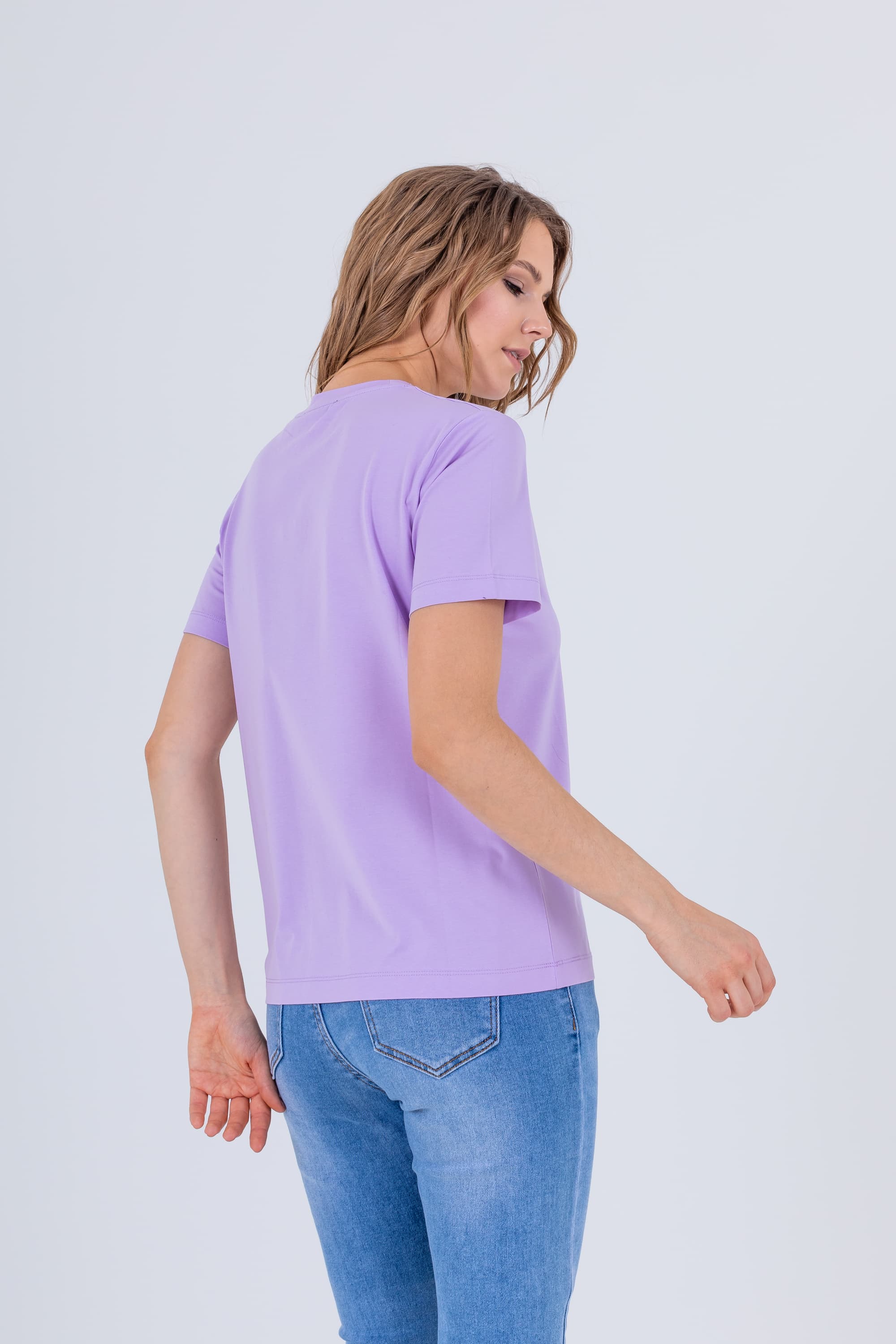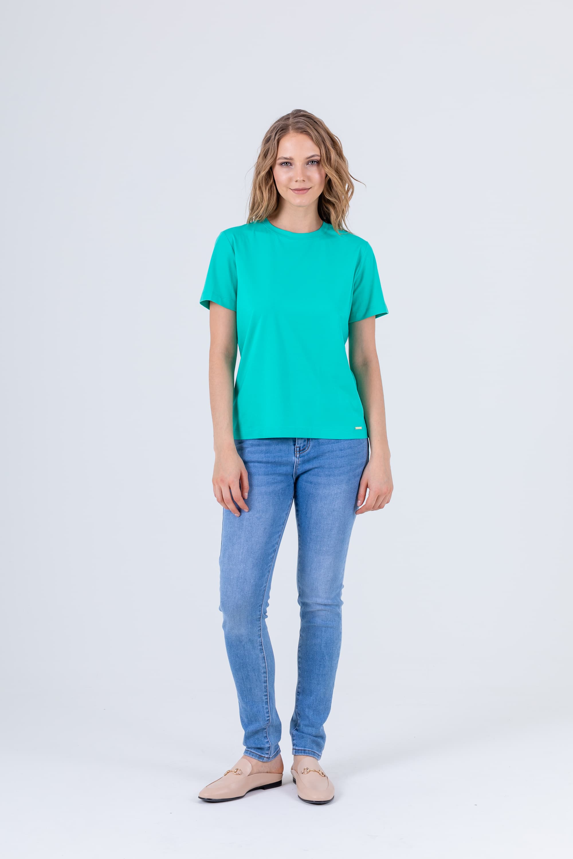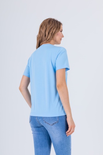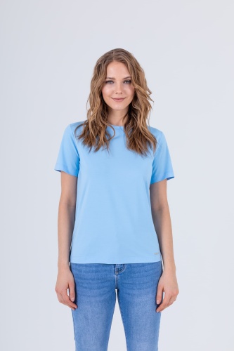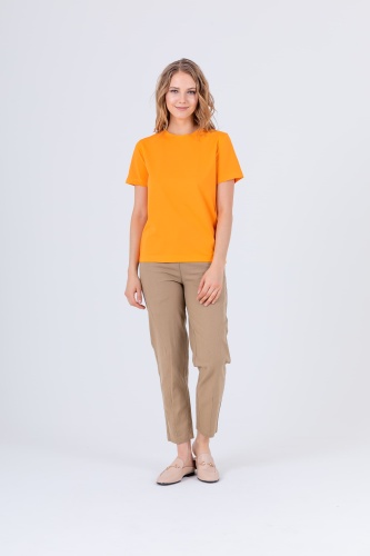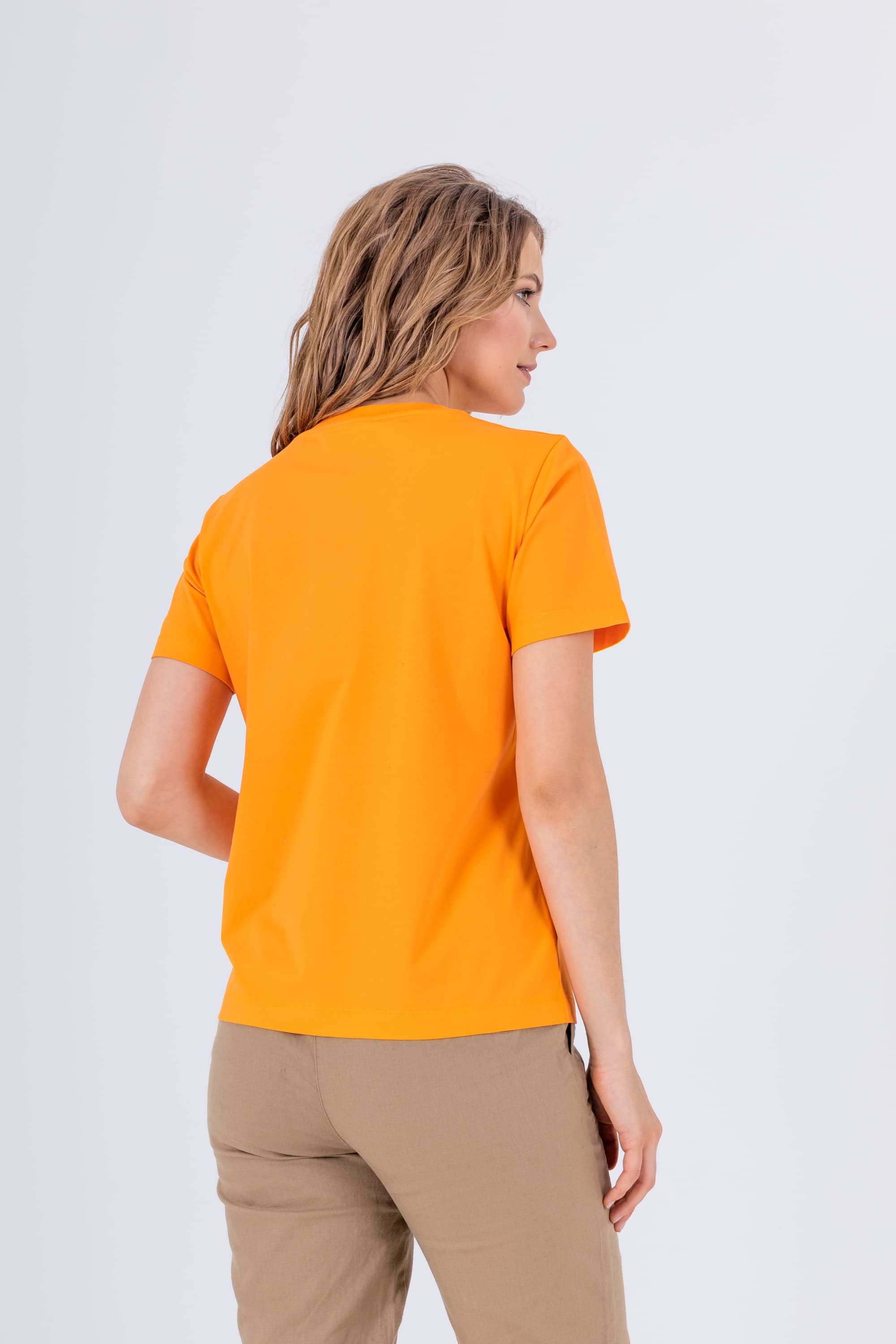 Яркая футболка средней длины прямого силуэта из легкого хлопка, мягкой вискозы и с добавлением эластана. Укороченные втачные рукава. Круглый вырез горловины.