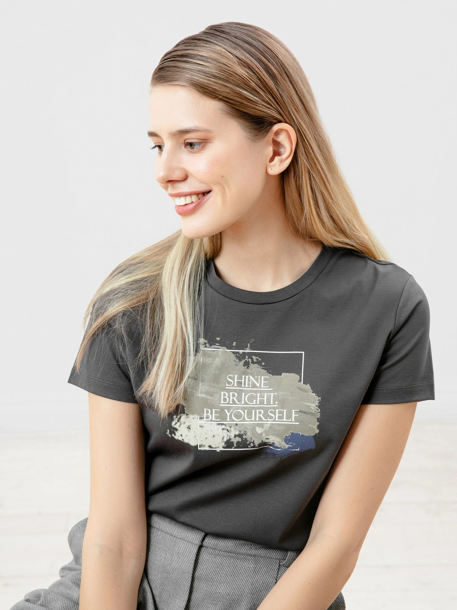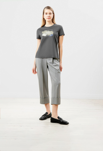 На сайте указаны российские размеры. Футболка полуприлегающего силуэта из трикотажного полотна темно-серого цвета с ярким контрастным абстрактным принтом. Вырез горловины круглый, рукав короткий втачной. Эта модель станет прекрасным нижним слоем под жакеты. Рост модели на фото - 175 см.