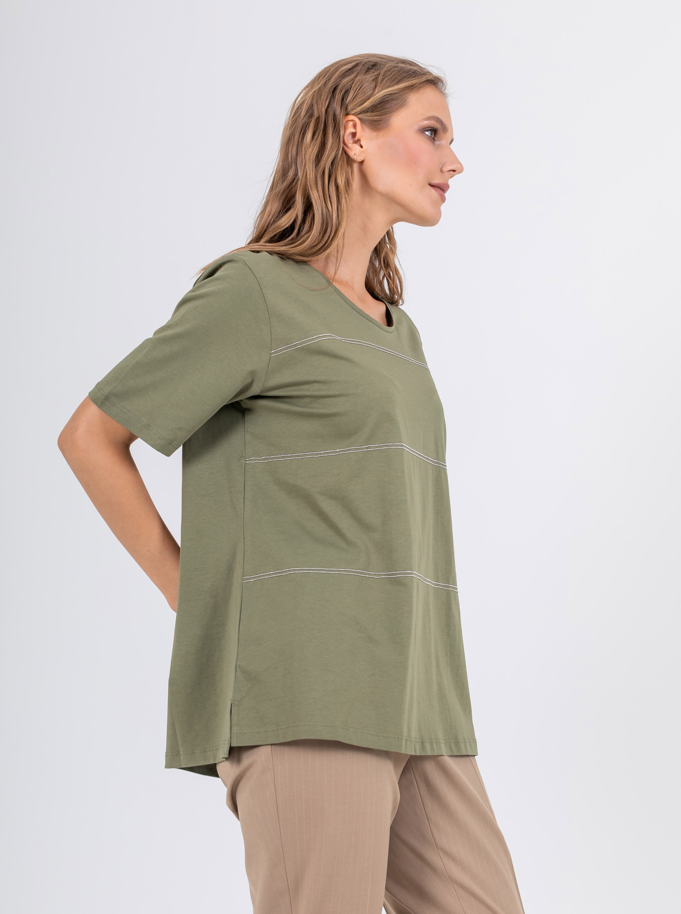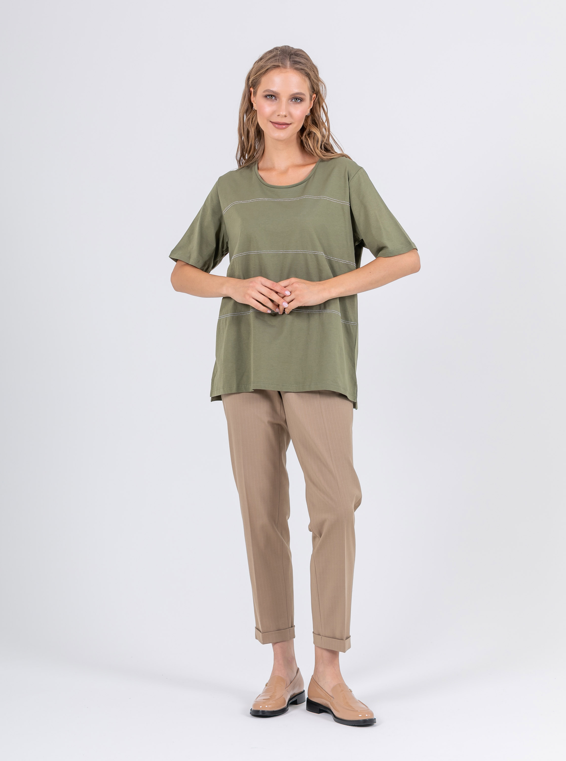 На сайте указаны российские размеры. Мягкая футболка из 100% хлопка. Свободный крой, круглый вырез горловины, рукава 1/3, слегка удлиненная спинка, по бокам небольшие разрезы. Перед модели акцентирован полосками из декоративных блестящих страз.