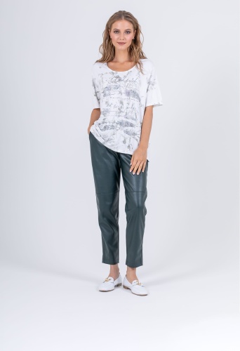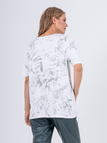 На сайте указаны российские размеры. Ткань: изготовлена из высококачественной вискозы (92%) – экологичного материала, хорошо пропускающего воздух и впитывающего излишки влаги, и эластана (8%), придающего ткани упругость. Крой: удлиненная футболка с цельнокроеным рукавом, который добавляет комфорта при носке и не стесняет движений, насколько активными вы бы не были. Модель идеально скрывает недостатки, не облегает фигуру, что делает ее идеальной вещью для женщин с пышными формами и большой грудью. Имеет неглубокий круглый вырез. Отделка: принт по всей поверхности футболки: в передней части на элементы рисунка нанесено сверкающее покрытие, которое выдерживает множество циклов стирки. В задней части футболки принт без нанесения.