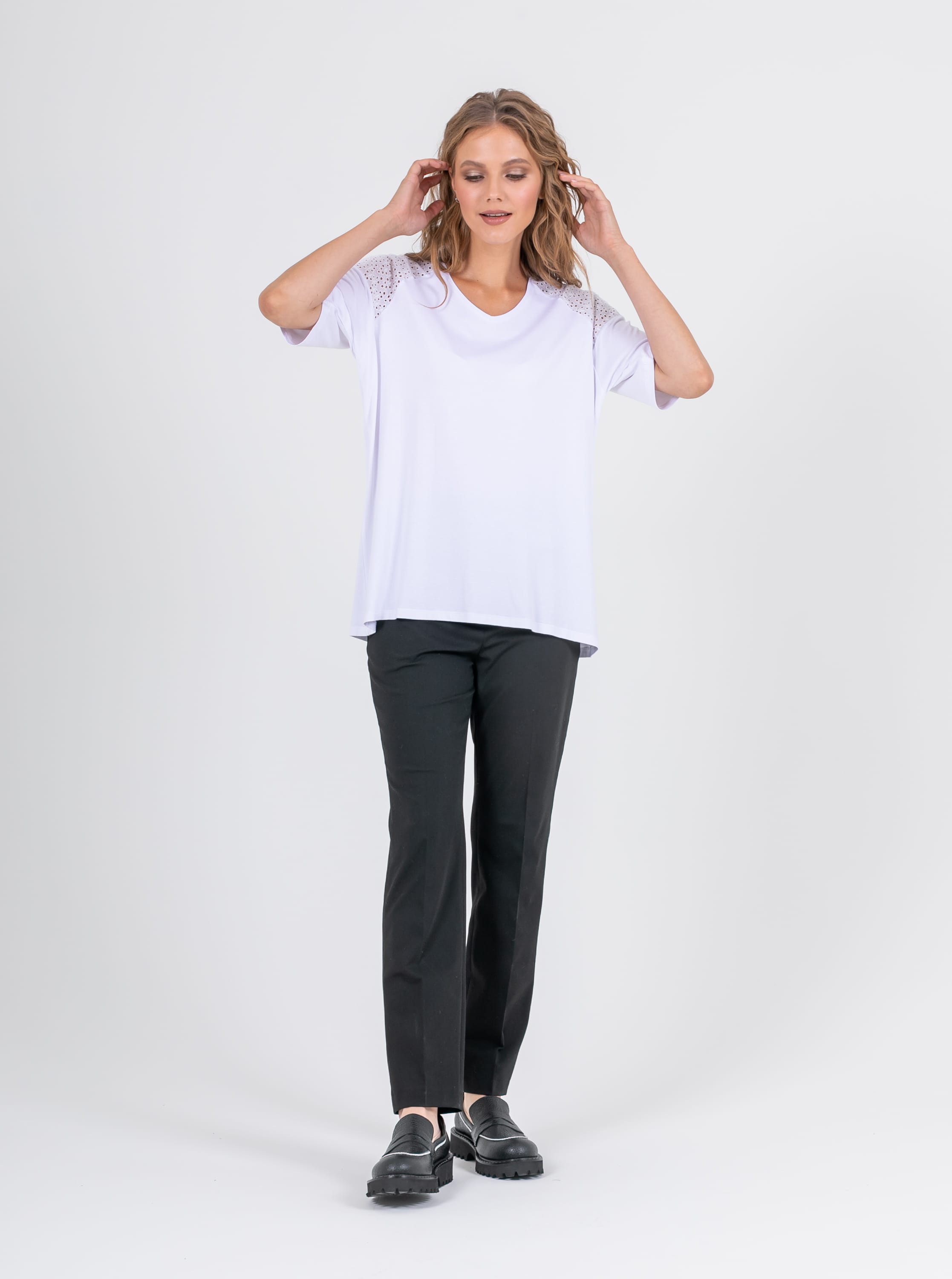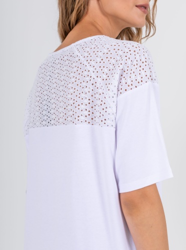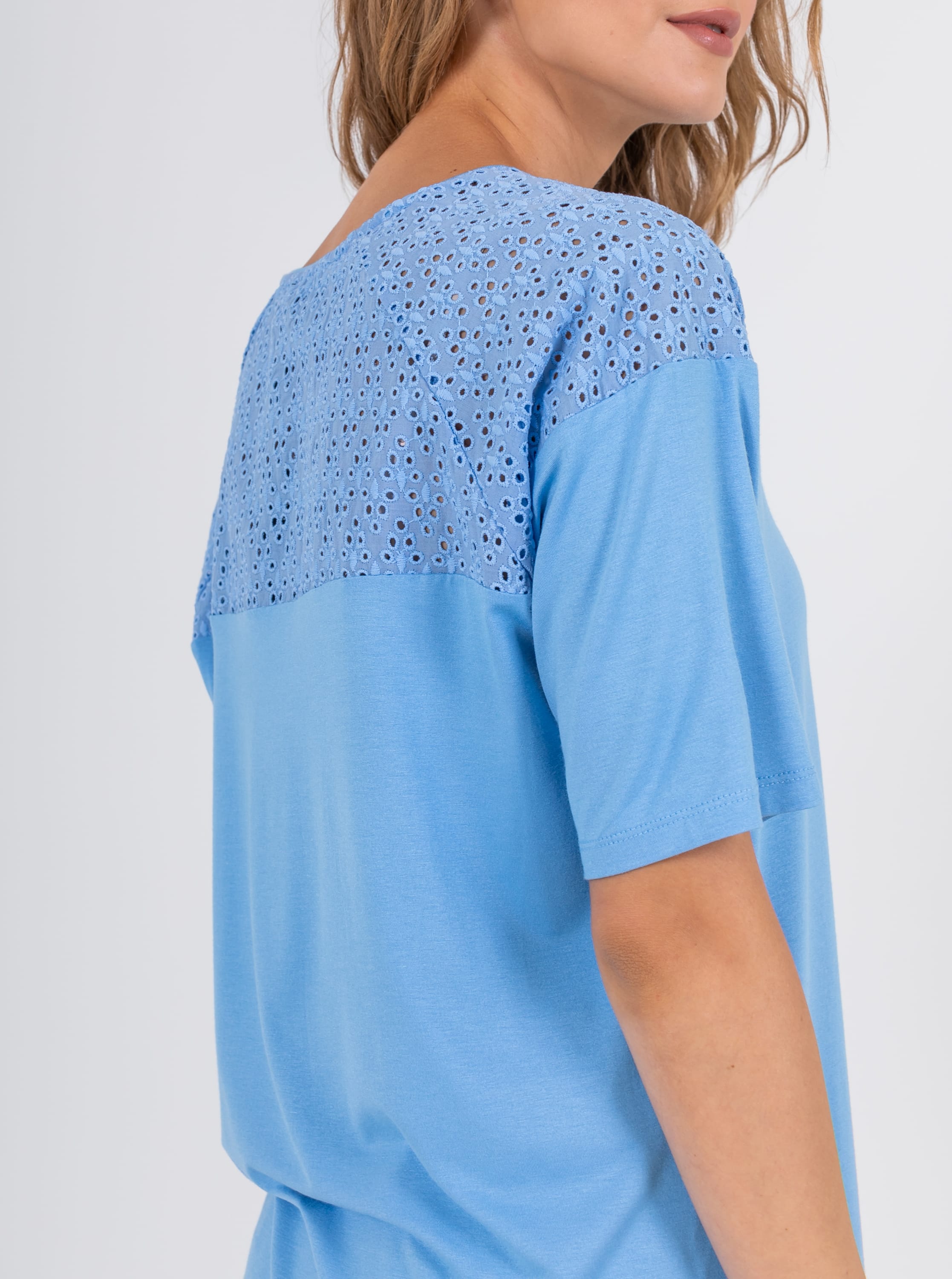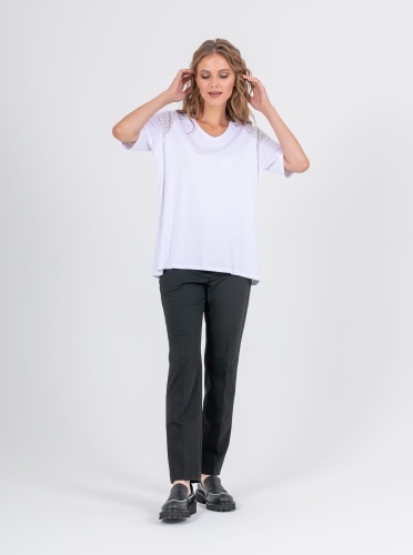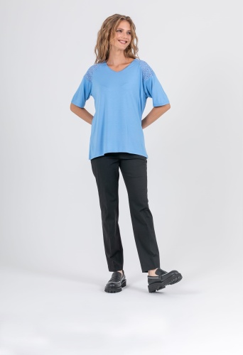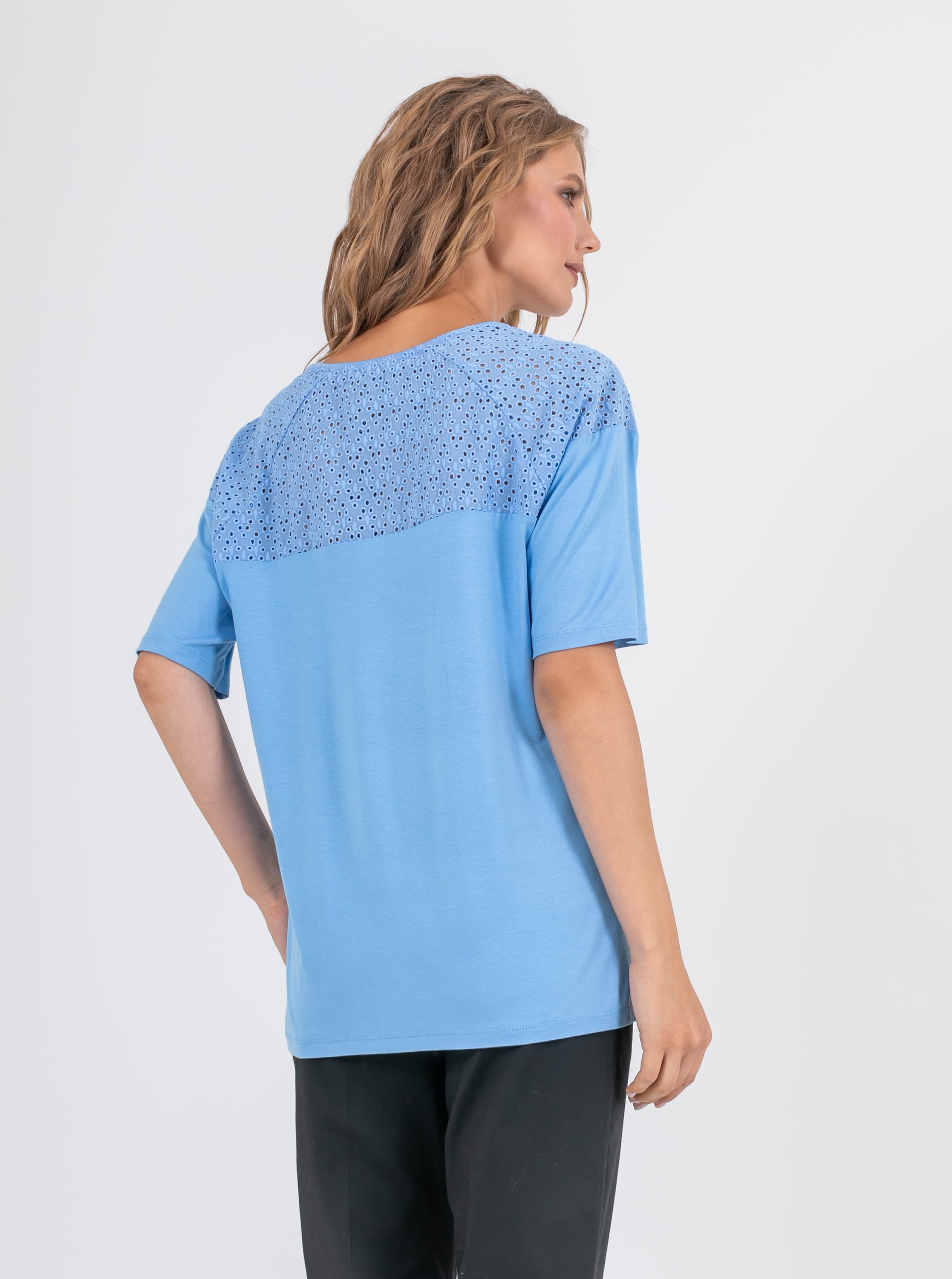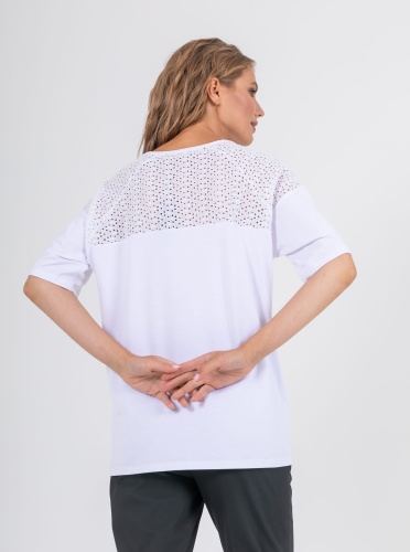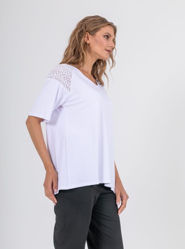 На сайте указаны российские размеры. Ткань: изготовлена из высококачественной вискозы (92%) – экологичного материала, хорошо пропускающего воздух и впитывающего излишки влаги, и эластана (8%), придающего ткани упругость. Крой: футболка средней длины свободного силуэта. Имеет круглый вырез и свободные рукава-регланы, которые дарят максимум свободы и комфорта. Представлена в двух цветах – белом и небесно-голубом. Отделка: рукава и верхняя часть спинки украшены изысканным шитьем, которое добавляет романтичности и женственности всему образу.