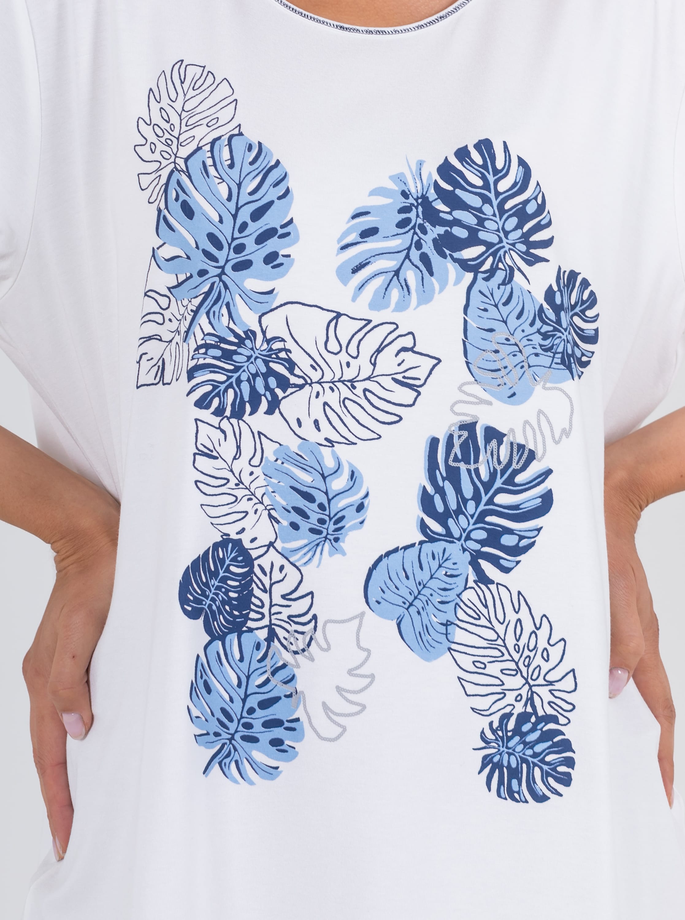 На сайте указаны российские размеры. Ткань: изготовлена из высококачественной вискозы (92%) – экологичного материала, хорошо пропускающего воздух и впитывающего излишки влаги, и эластана (8%), придающего ткани упругость. Крой: футболка удлиненная прямого силуэта с коротким свободным рукавом-регланом. Классическая модель с круглым вырезом – база, которая прекрасно смотрится на женщинах разного роста и комплекций. Обеспечивает максимальный комфорт, прекрасно садится по фигуре. Отделка: футболку украшает стильный принт с актуальными уже несколько сезонов монстерами. Вырез обрамляет контрастная синяя строчка-зигзаг, добавляющая образу оригинальности.