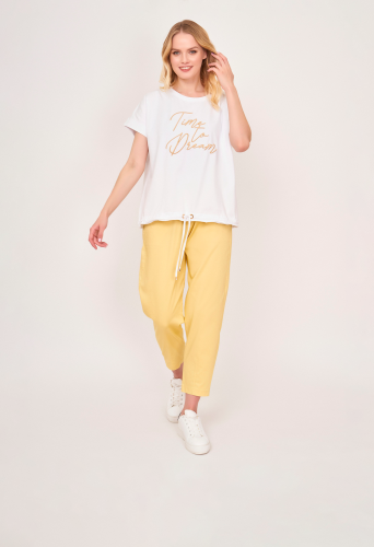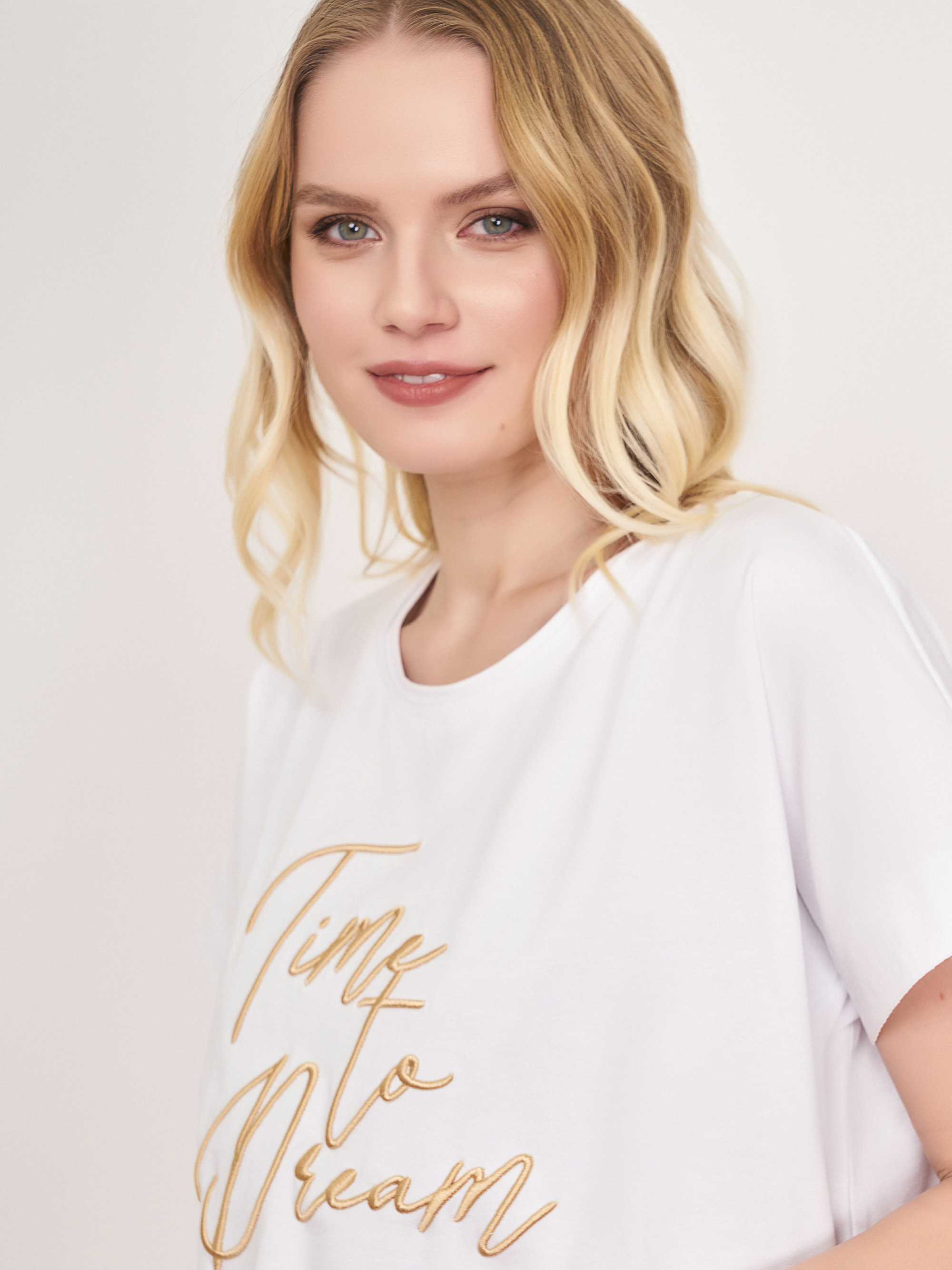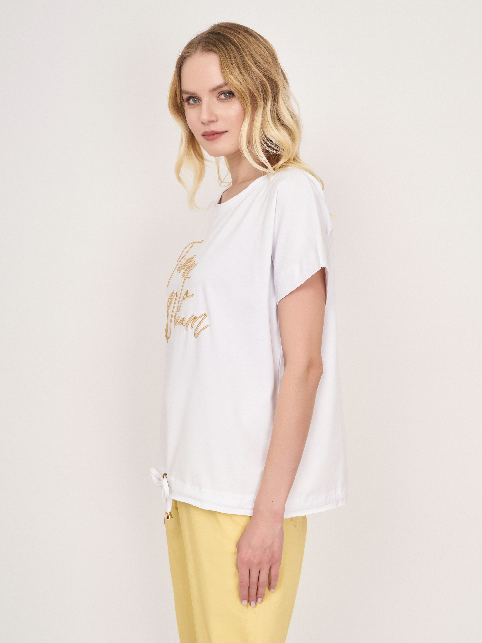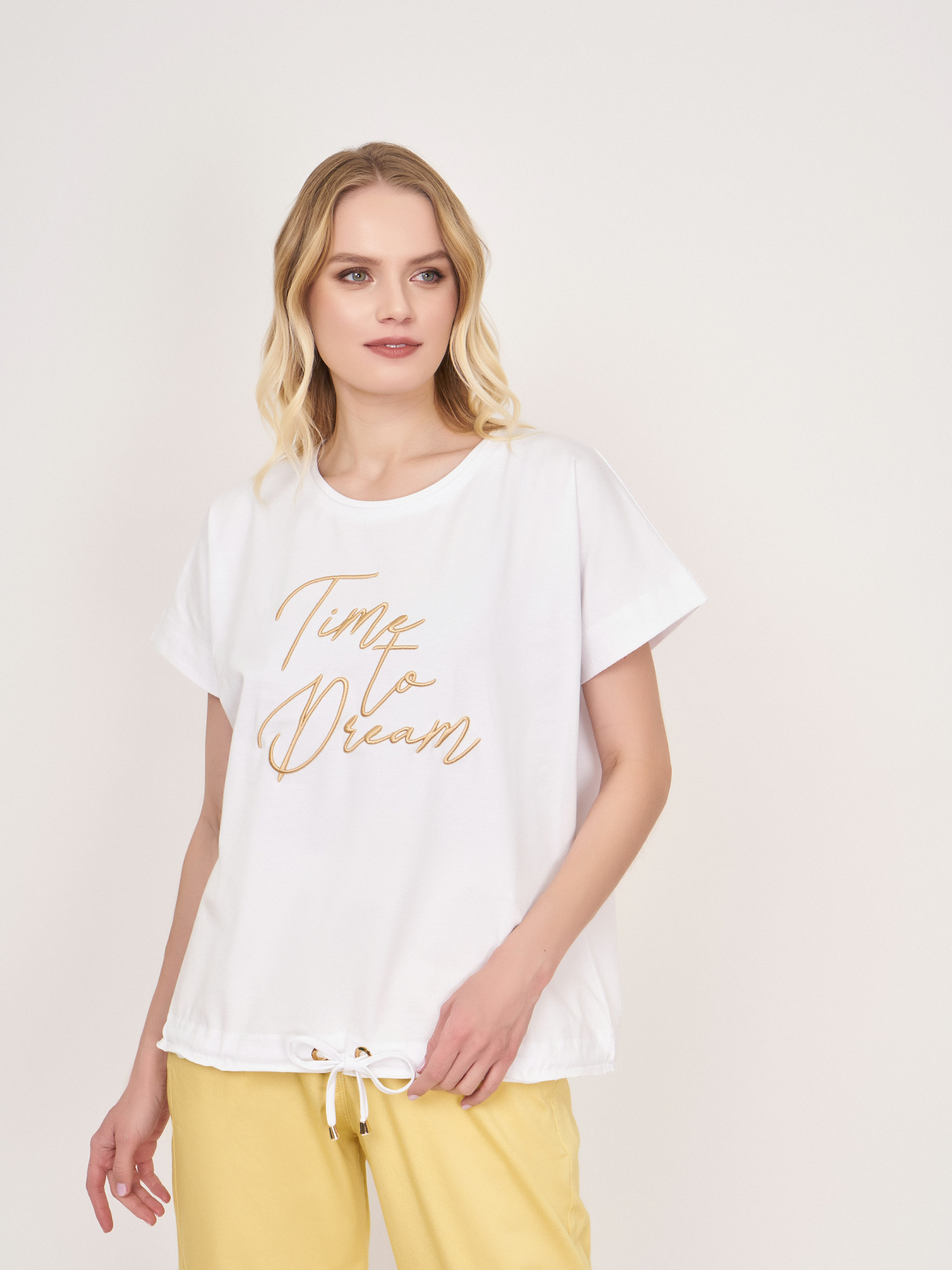 На сайте указаны российские размеры. Белый прямой хлопковый джемпер-футболка с круглым вырезом, с коротким рукавом, с бежевой вышитой надписью, с кулиской понизу изделия. Длина по спинке: 60 см. Рост модели: 176 см.