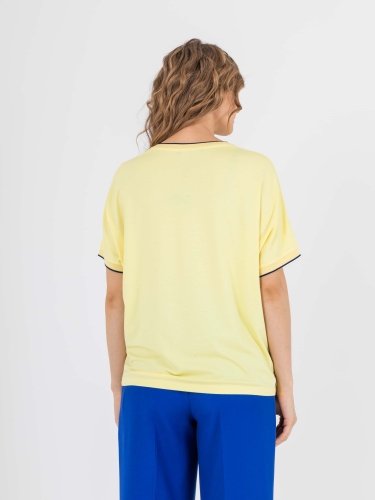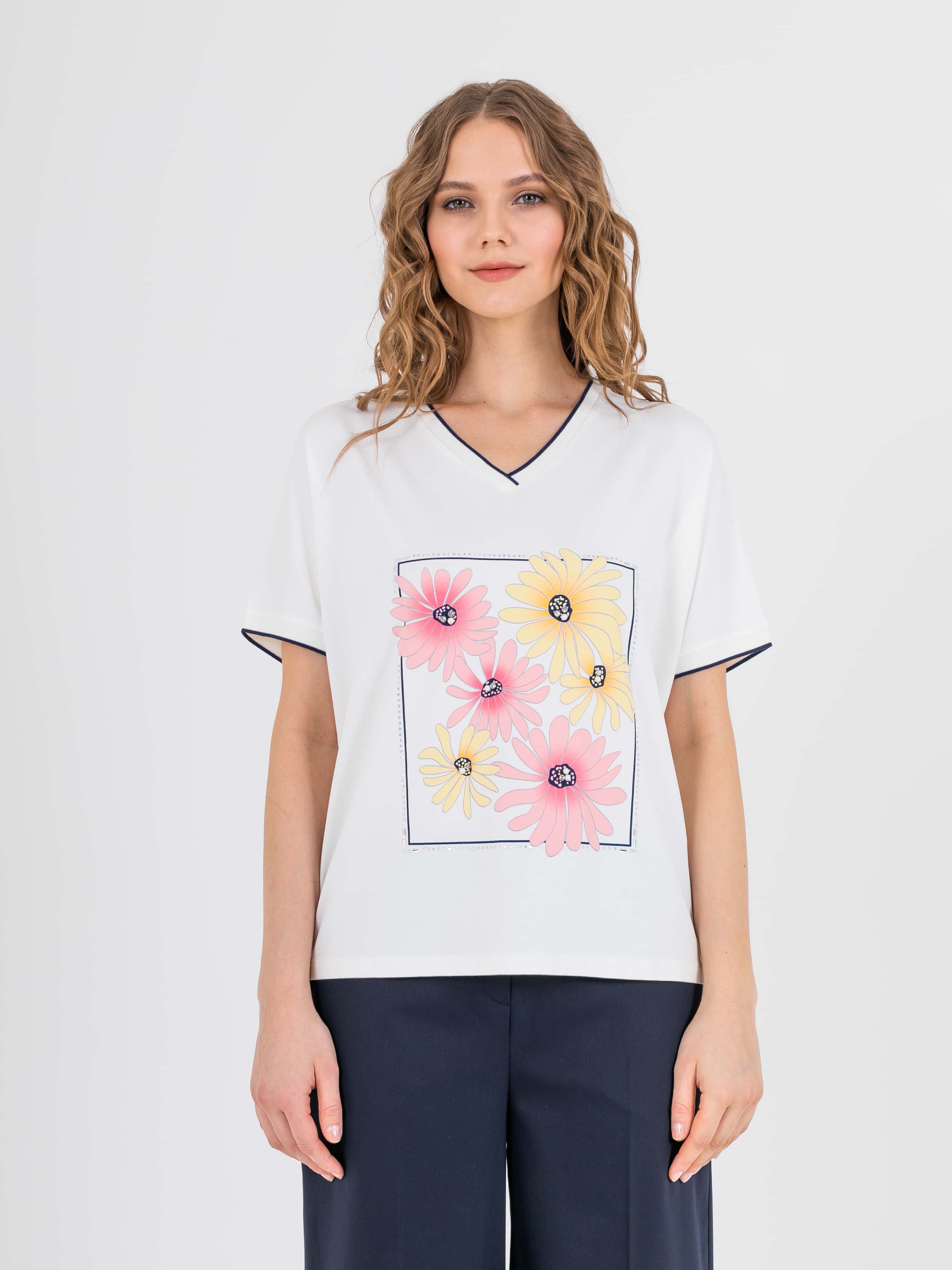 На сайте указаны российские размеры. Оверсайз футболка средней длины прямого силуэта из легкой, мягкой вискозы с добавлением эластана. По переду выполнен яркий принт и аппликация со стразами. Укороченные цельнокроеные рукава с манжетами и контрастным кантом. V-образный вырез горловины, обработанный трикотажной косой бейкой с контрастным кантом.