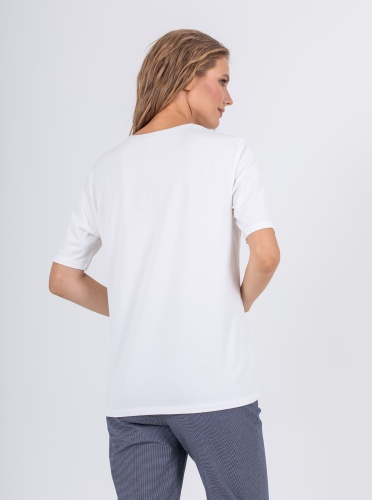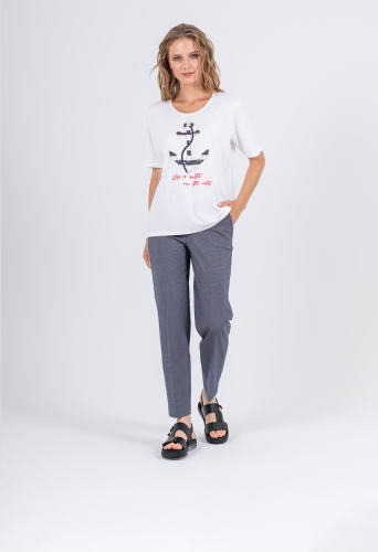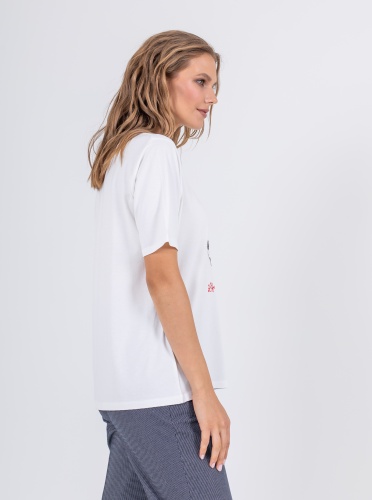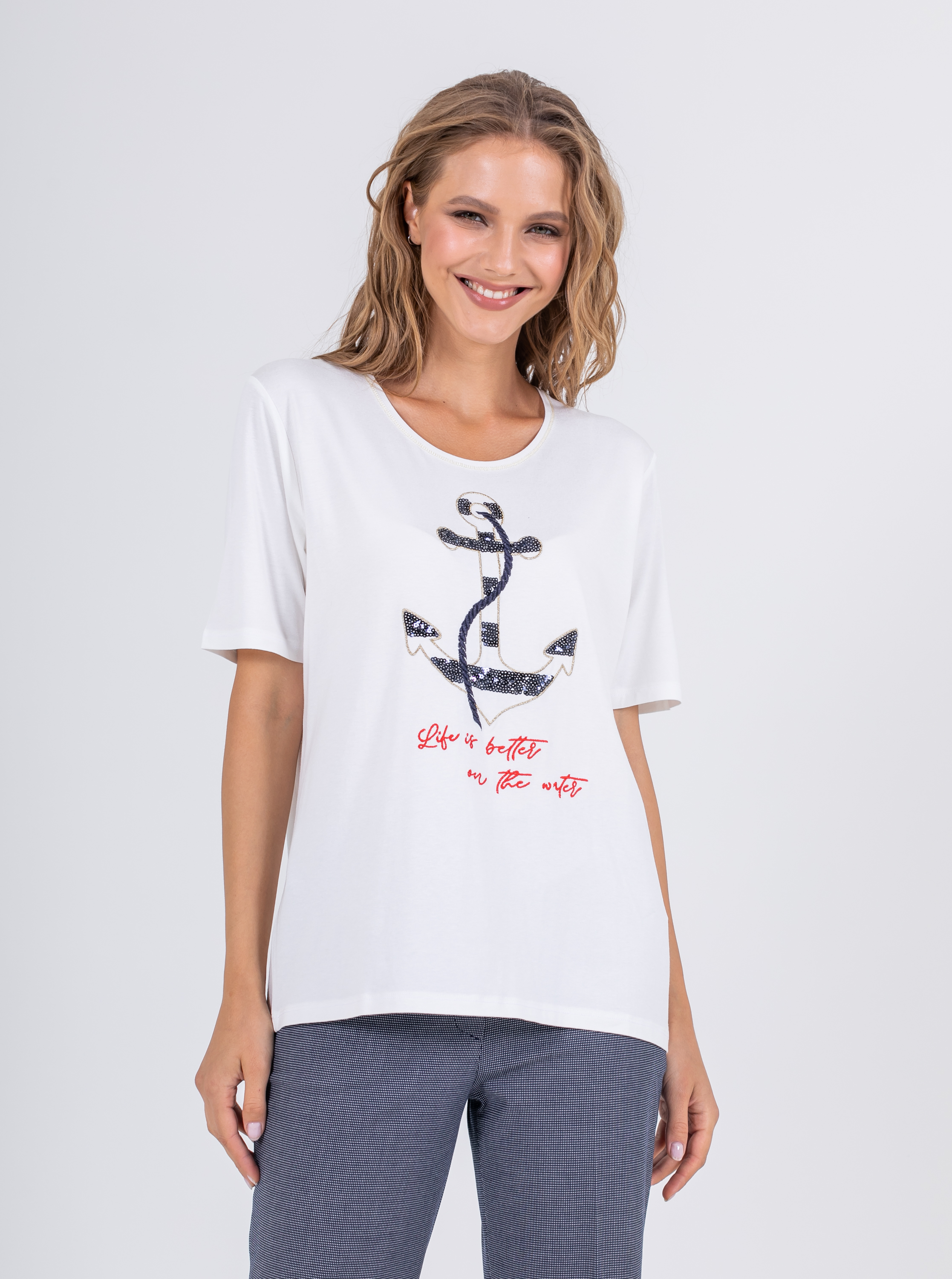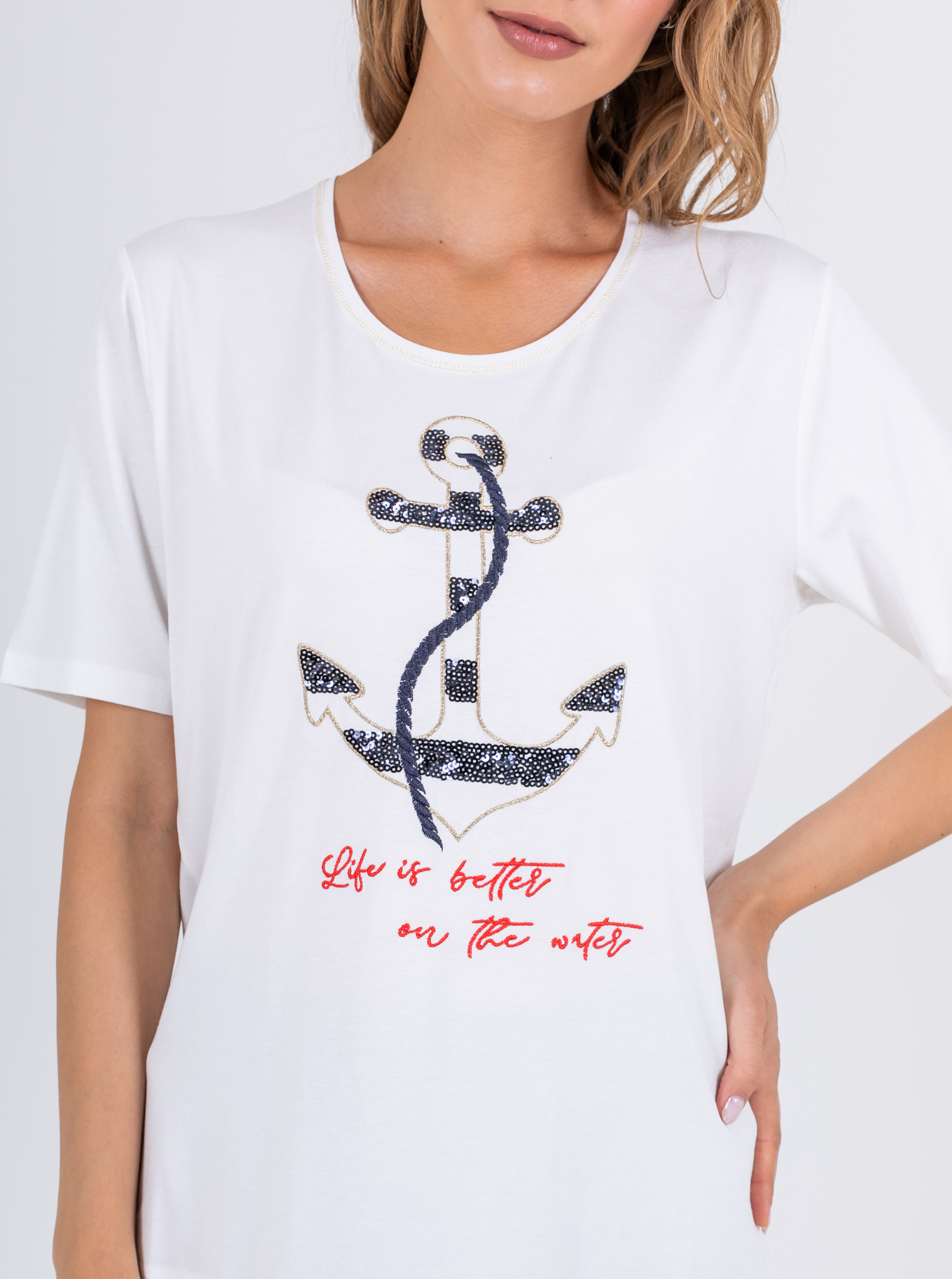 Длинная футболка прямого силуэта из легкой, мягкой вискозы с добавлением эластана. По переду выполнен яркий принт в морском стиле, дополненный вышивкой пайетками. Укороченные втачные рукава. Круглый вырез горловины.