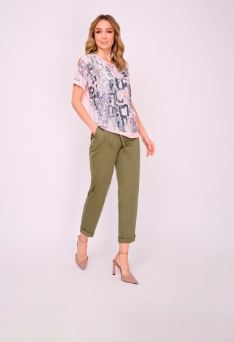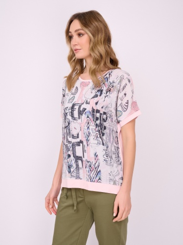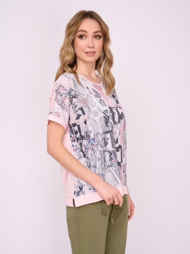 На сайте указаны российские размеры. Трикотажная прямая бледно-розовая футболка с круглым вырезом, с коротким рукавом, с цветочным рисунком и стразами. Длина по спинке: 60 см. Рост модели: 175 см.