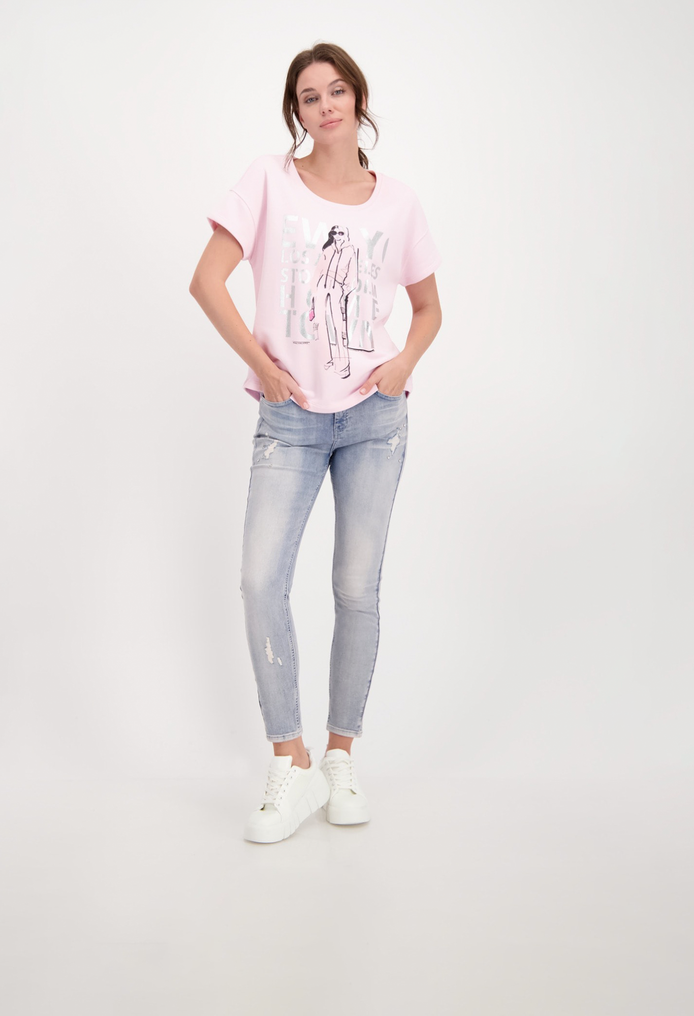 На сайте указаны российские размеры. Футболка с круглым вырезом горловины, заниженной линией плеч и закругленным низом. Благодаря стандартному крою с рукавами до половины и качеству хлопка и модала гарантируется комфортная посадка. Эскиз принта спереди с глянцевой надписью и стразами гламурно украшает перед. Когда дело доходит до стиля, вы не ошибетесь, выбрав эту толстовку с коротким рукавом. Длина в размере 44: 64 см. Рост модели 179 см.