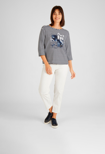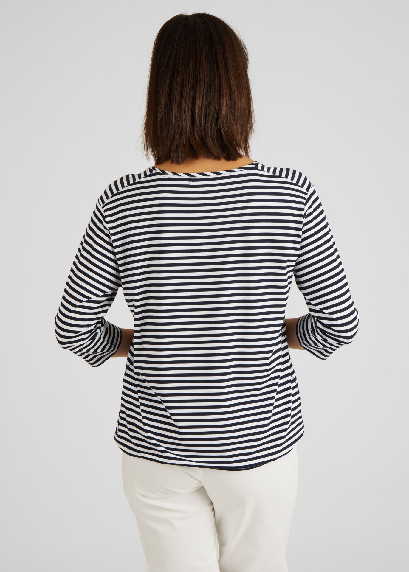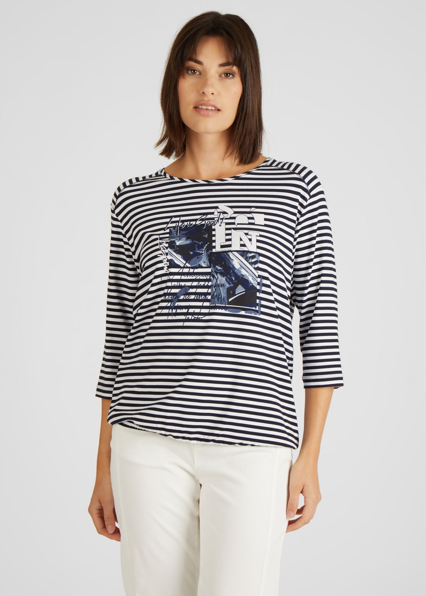 На сайте указаны российские размеры. Футболка с рукавами 3/4 из эластичного трикотажа качества вискозы – это абсолютный талант сочетания. Рубашка в полоску с абстрактным узором и надписью спереди привлекает внимание. Круглый вырез и резинка по низу обеспечивают идеальную посадку. Сочетайте рубашку с кроссовками и любимыми брюками. Длина по спинке от плеча для размера 46: 64 см. Рост модели 176 см.