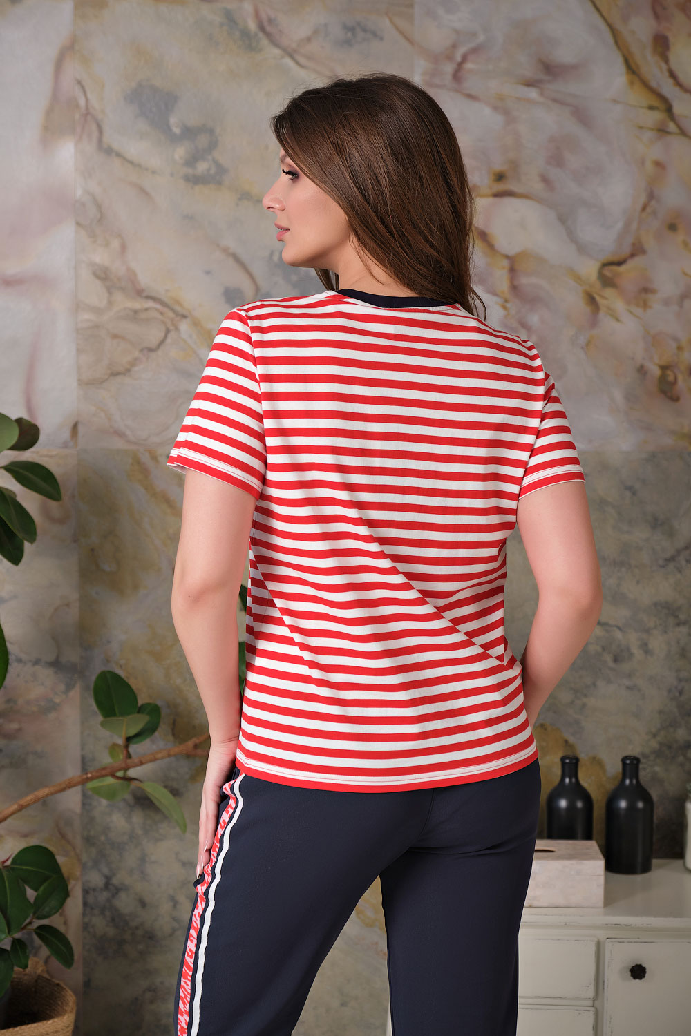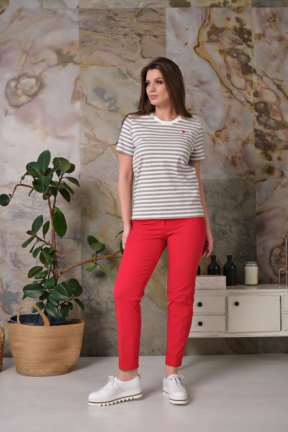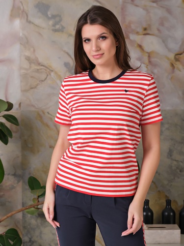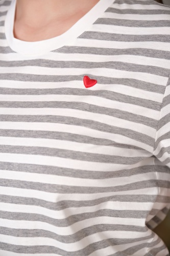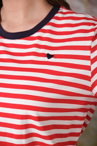 Ткань из натуральных материалов обеспечит комфорт и прохладу жарким летом. Свободный покрой скроет недостатки фигуры. Поверх принта "полоска" располагается вышивка "сердце". Простой и лаконичный дизайн делает данную модель базовой, позволяя удачно сочетать ее с разными комплектами одежды.