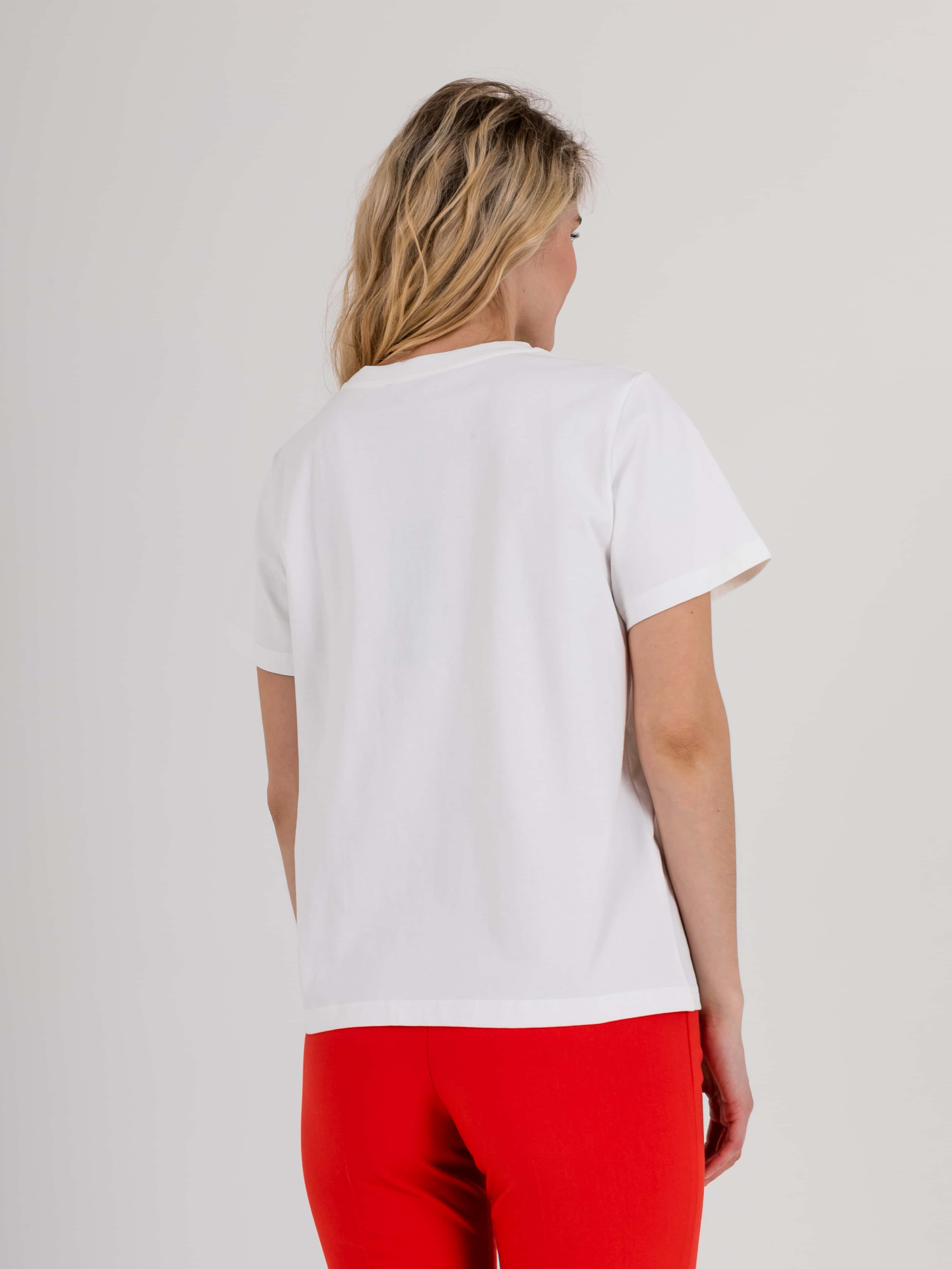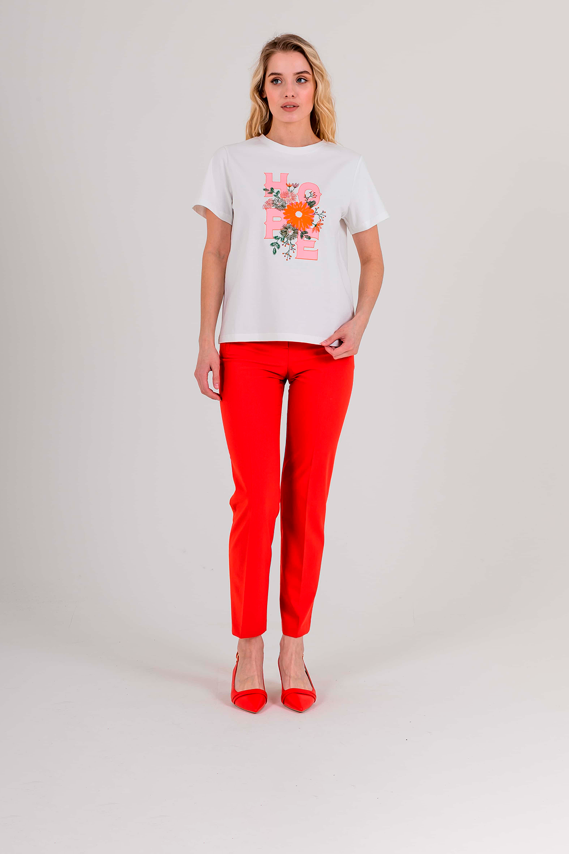 Футболка средней длины прямого силуэта из легкого 100% хлопка. По переду выполнен яркий принт с растительной вышивкой. Укороченные втачные рукава. Круглый вырез горловины.