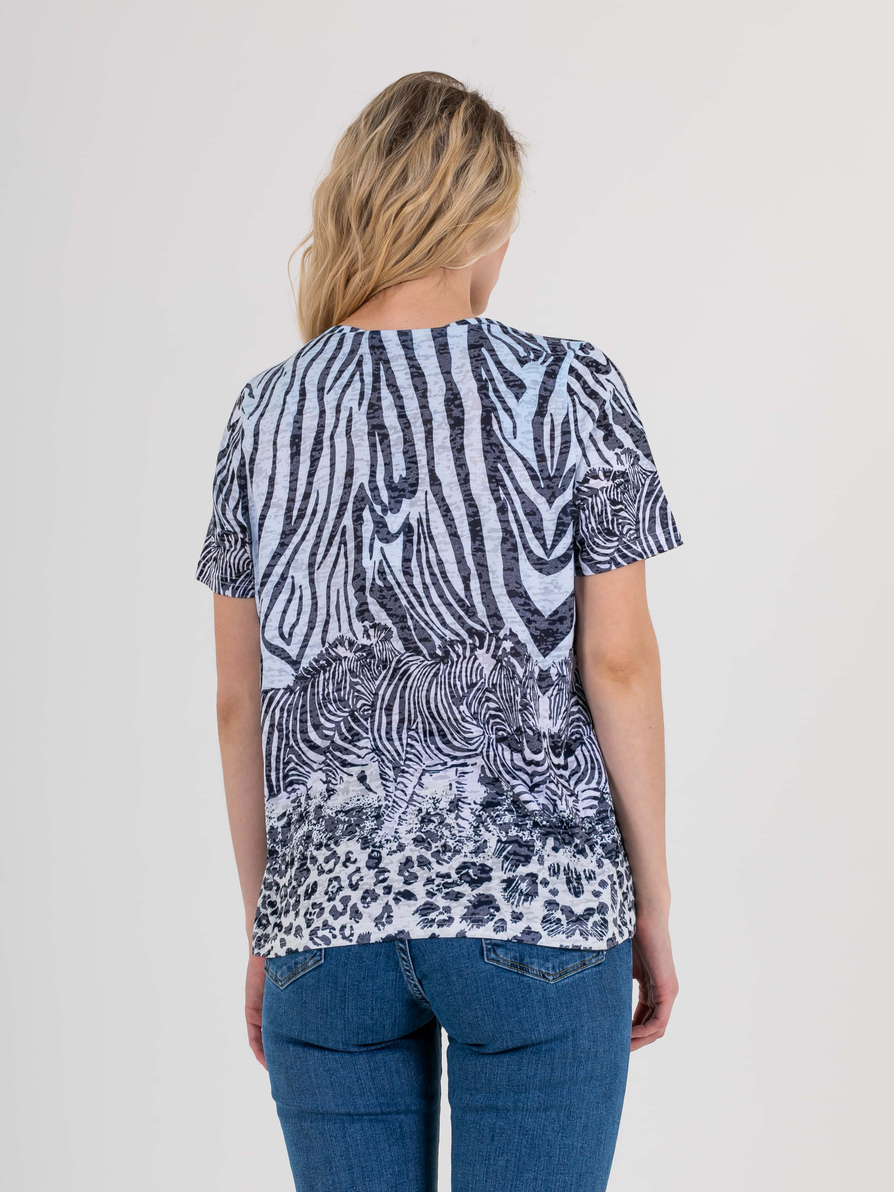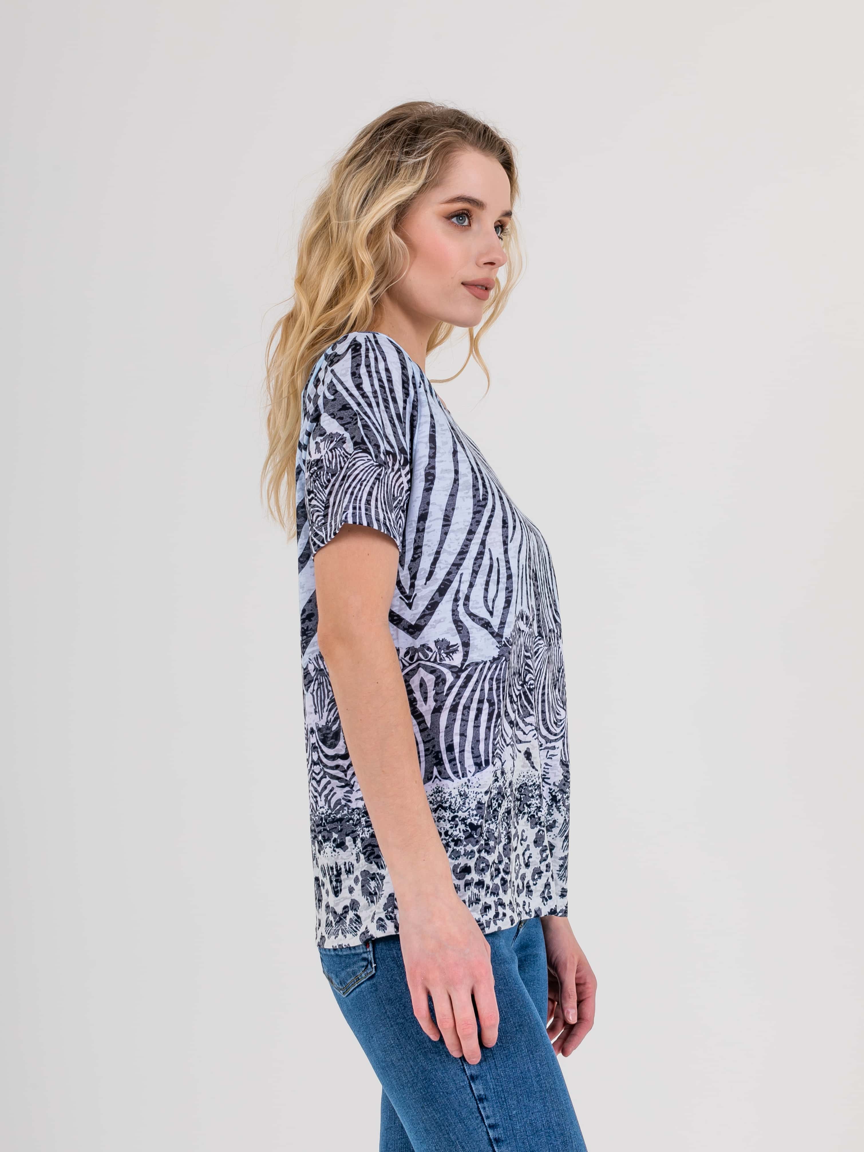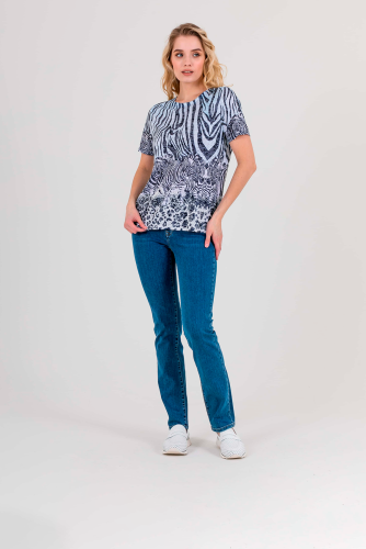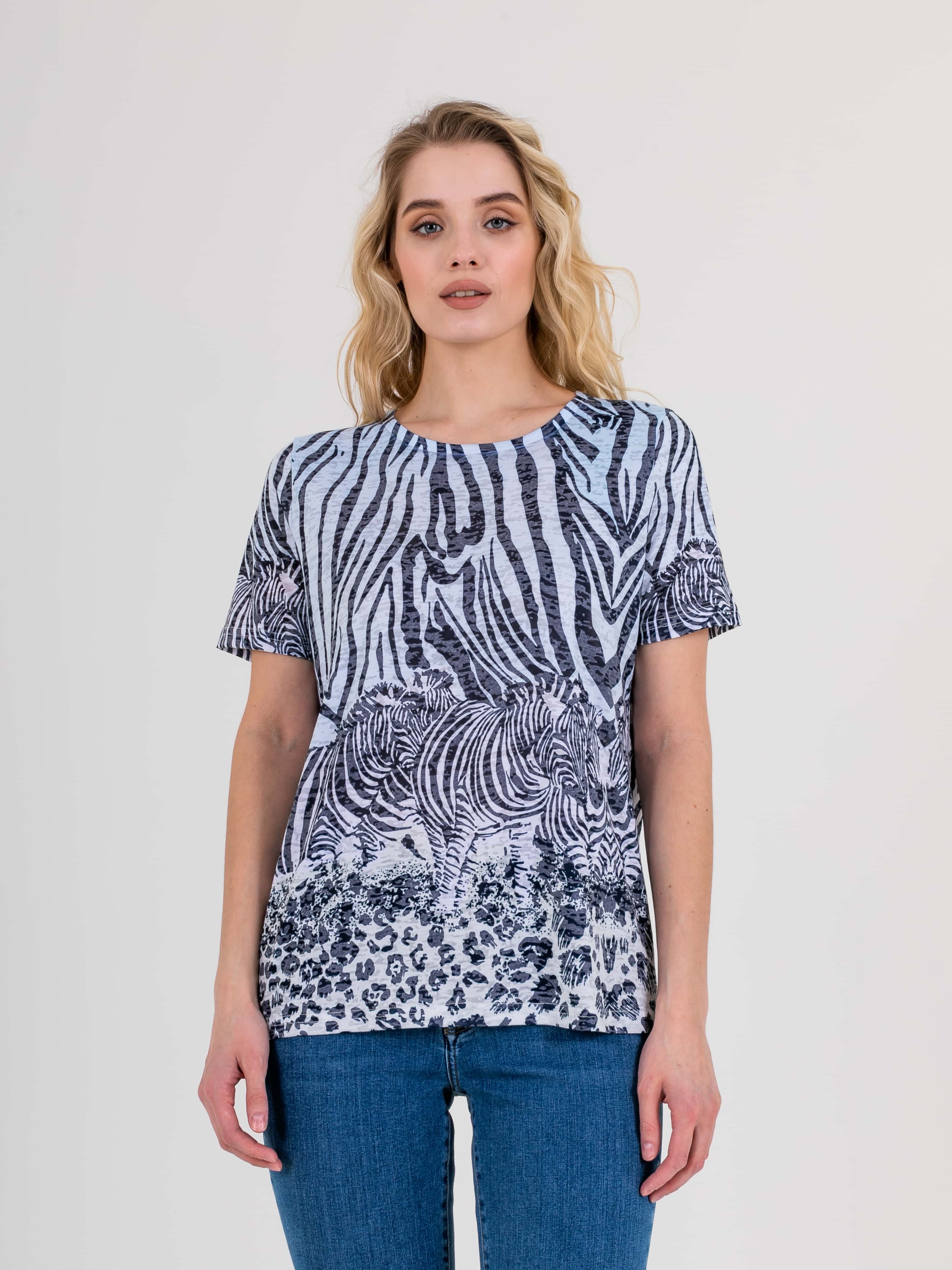 Футболка средней длины прямого силуэта из полиэстера с добавлением мягкой вискозы, дизайнерская особенность модели – яркий принт «зебра» и фактурный трикотаж. Укороченные втачные рукава. Круглый вырез горловины.