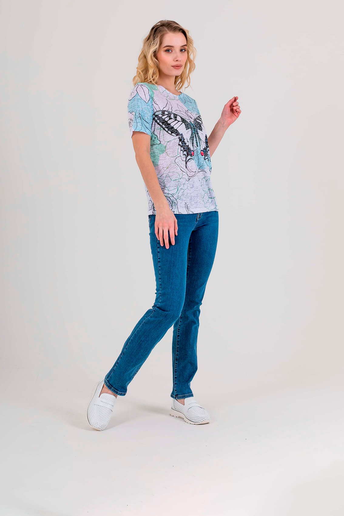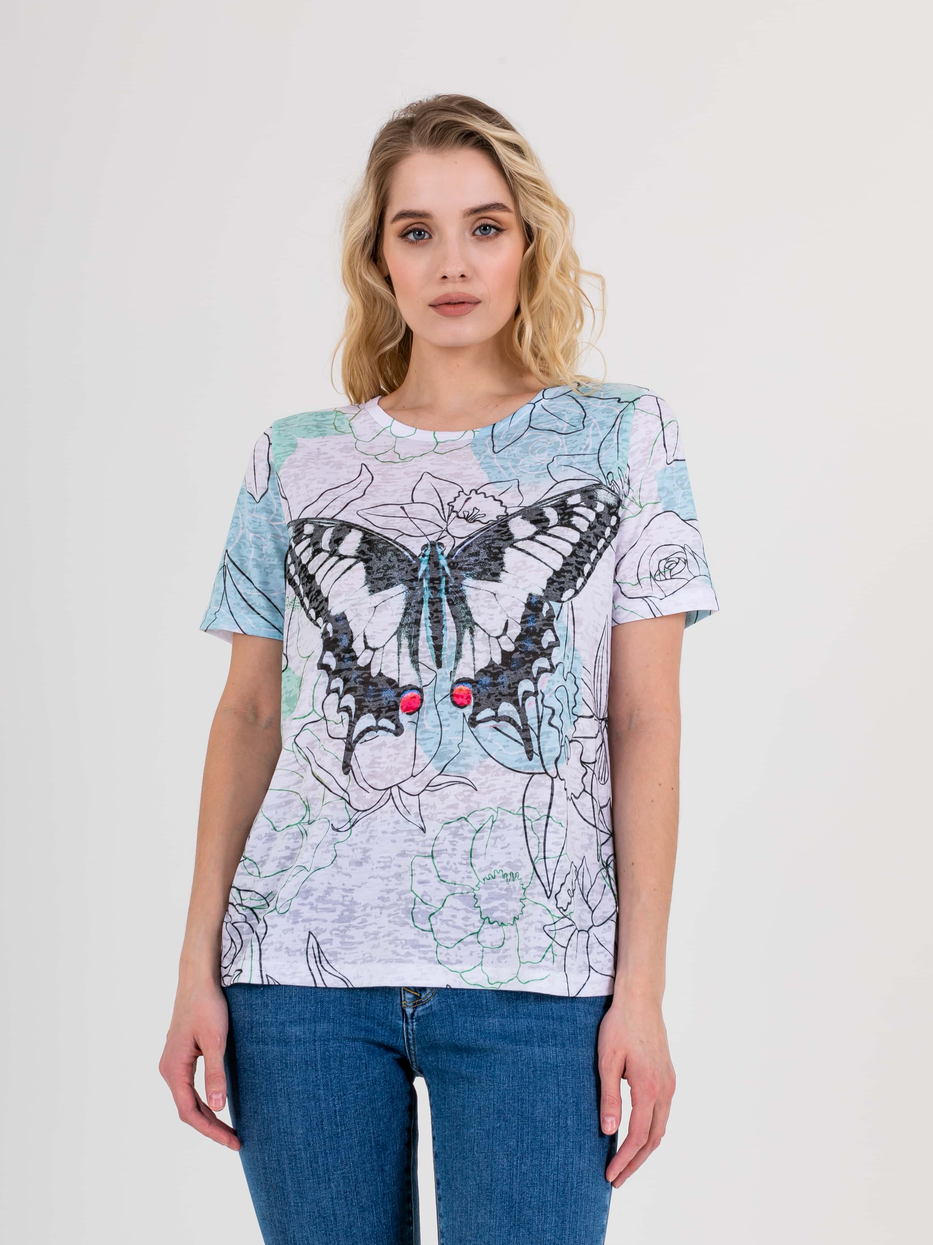 Футболка средней длины прямого силуэта из полиэстера с добавлением мягкой вискозы, дизайнерская особенность модели – нежный флористический принт и фактурный трикотаж. Укороченные втачные рукава. Круглый вырез горловины.