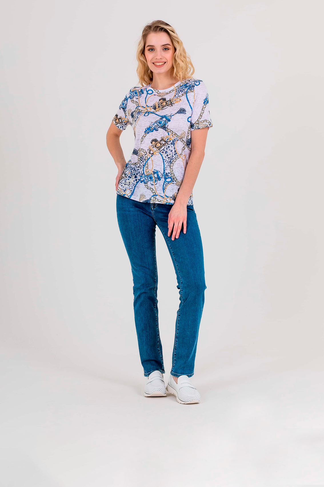 Футболка средней длины прямого силуэта из полиэстера с добавлением мягкой вискозы, дизайнерская особенность модели – эффектный принт и фактурный трикотаж. Укороченные втачные рукава. Круглый вырез горловины.