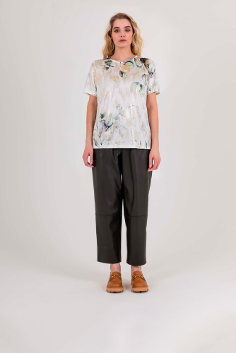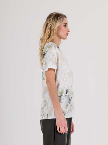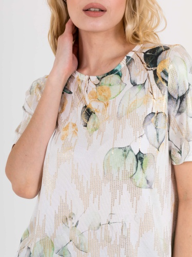 Футболка средней длины прямого силуэта из полиэстера с добавлением эластана, дизайнерская особенность модели –нежный растительный принт с имитацией пайеток. Укороченные втачные рукава. Круглый вырез горловины.
