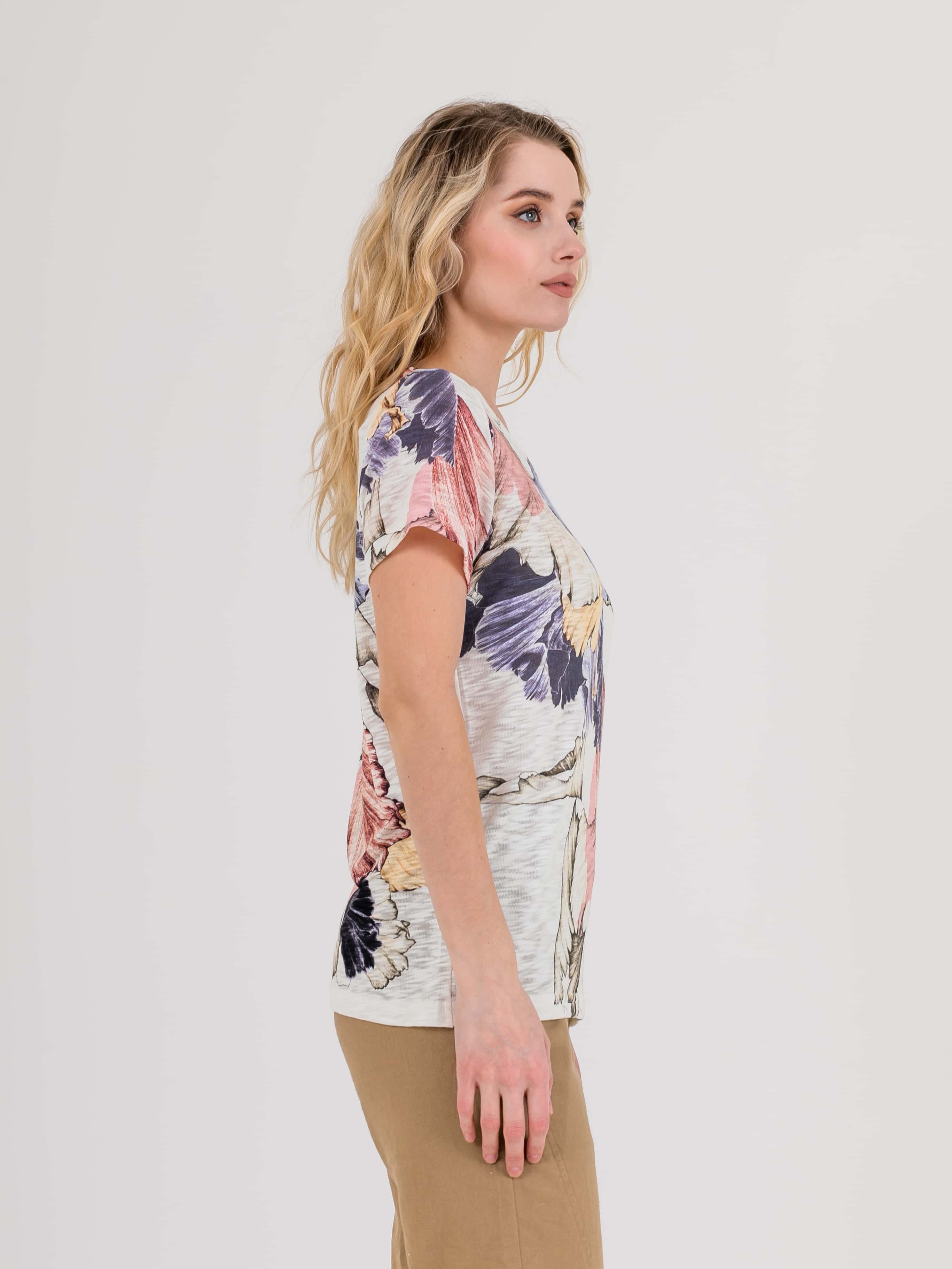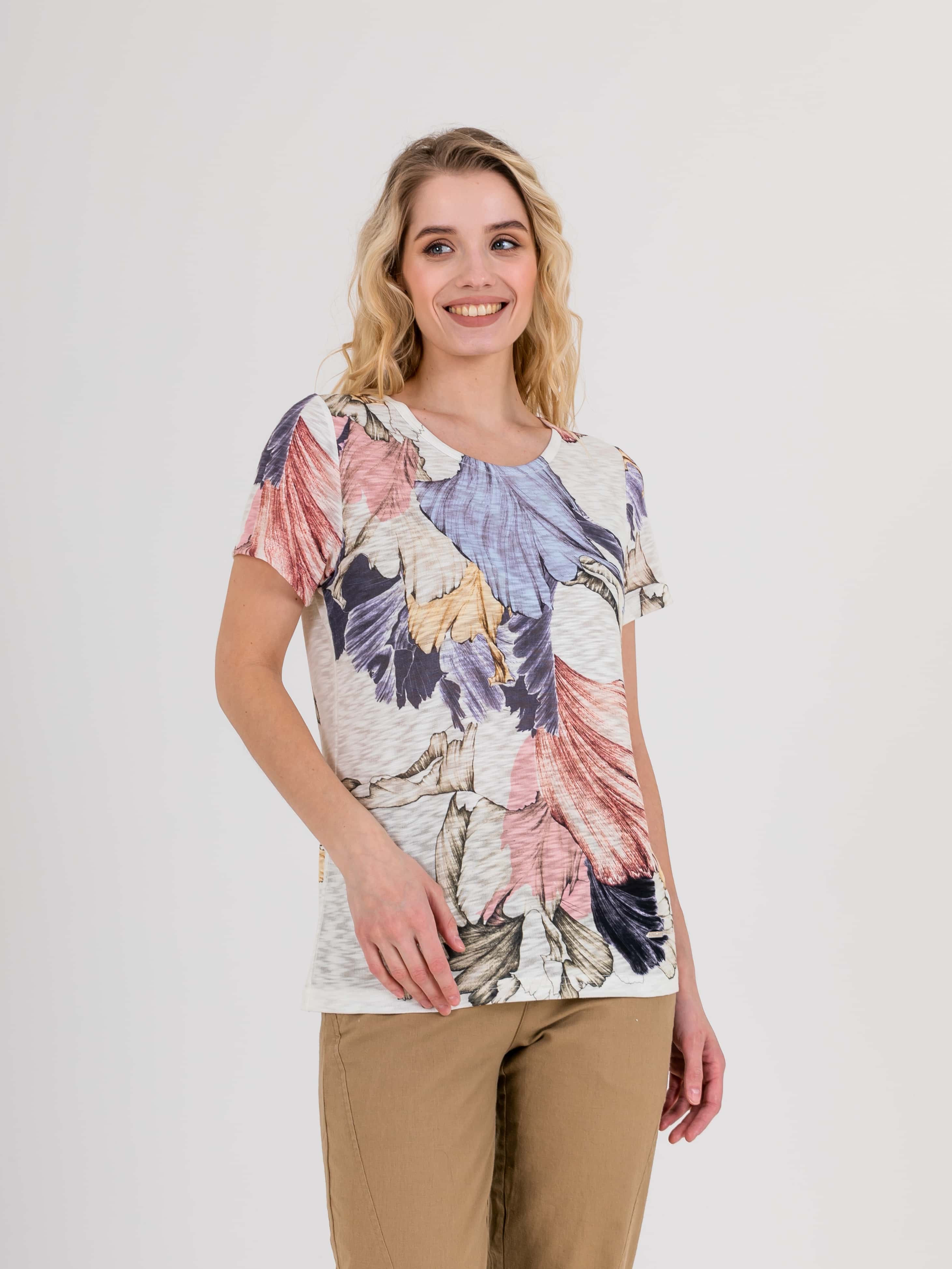 Футболка средней длины прямого силуэта из полиэстера с добавлением эластана, дизайнерская особенность модели – яркий растительный принт. Укороченные втачные рукава. Круглый вырез горловины.