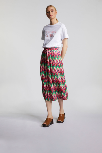 Привлекательным элементом этой футболки из органического хлопка является размещенный принт с надписью «Кто эта девушка». Это также обеспечивается каймой со стразами. В остальном свободный крой верха характерен для рубашки с круглым вырезом, рукавом в четверть и небольшими боковыми разрезами. Длина в размере 42: 61см