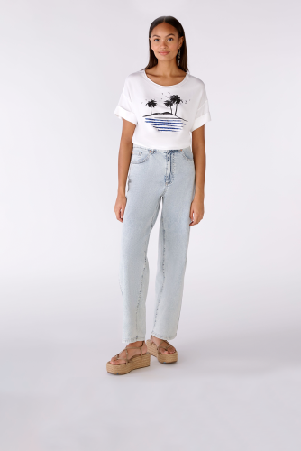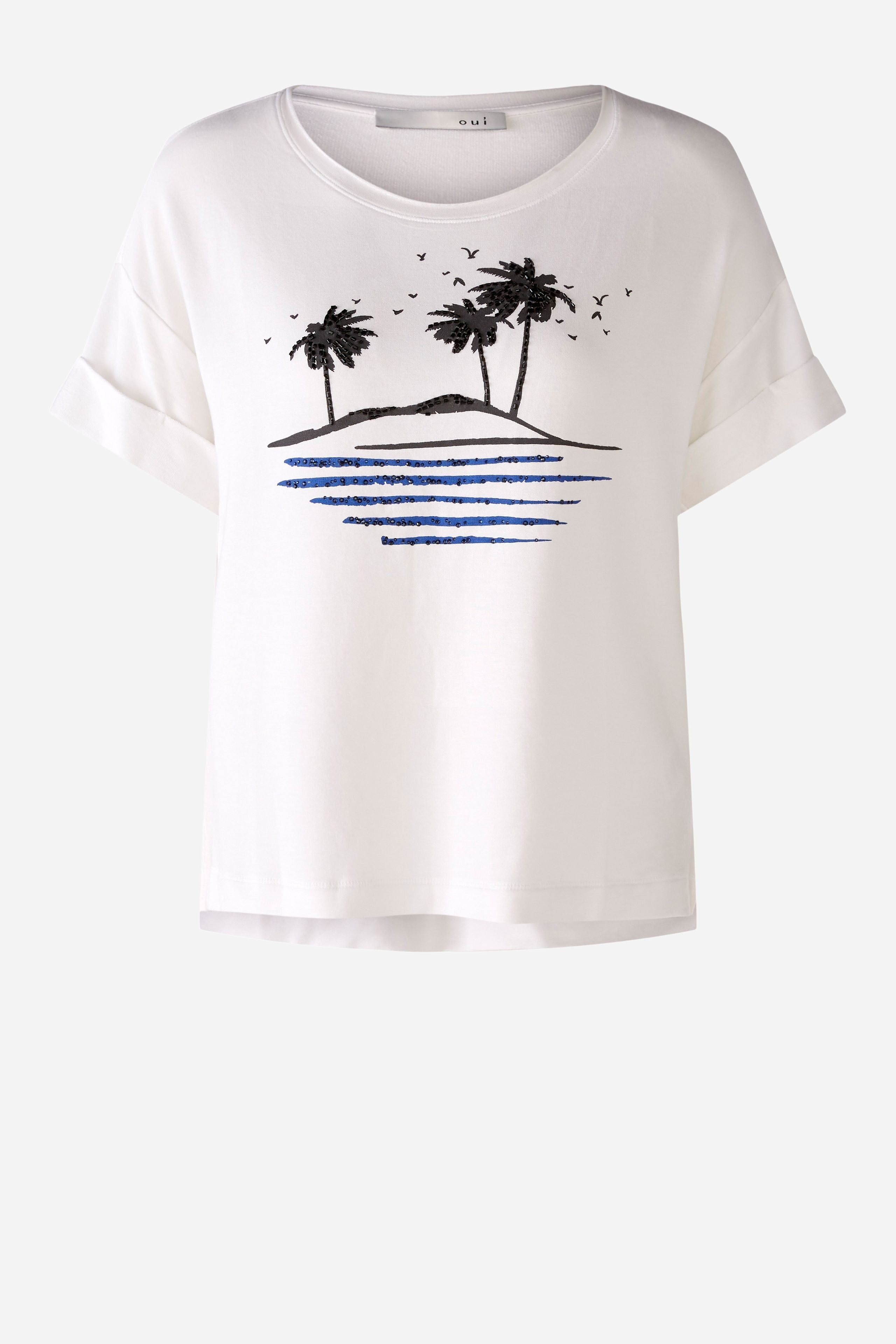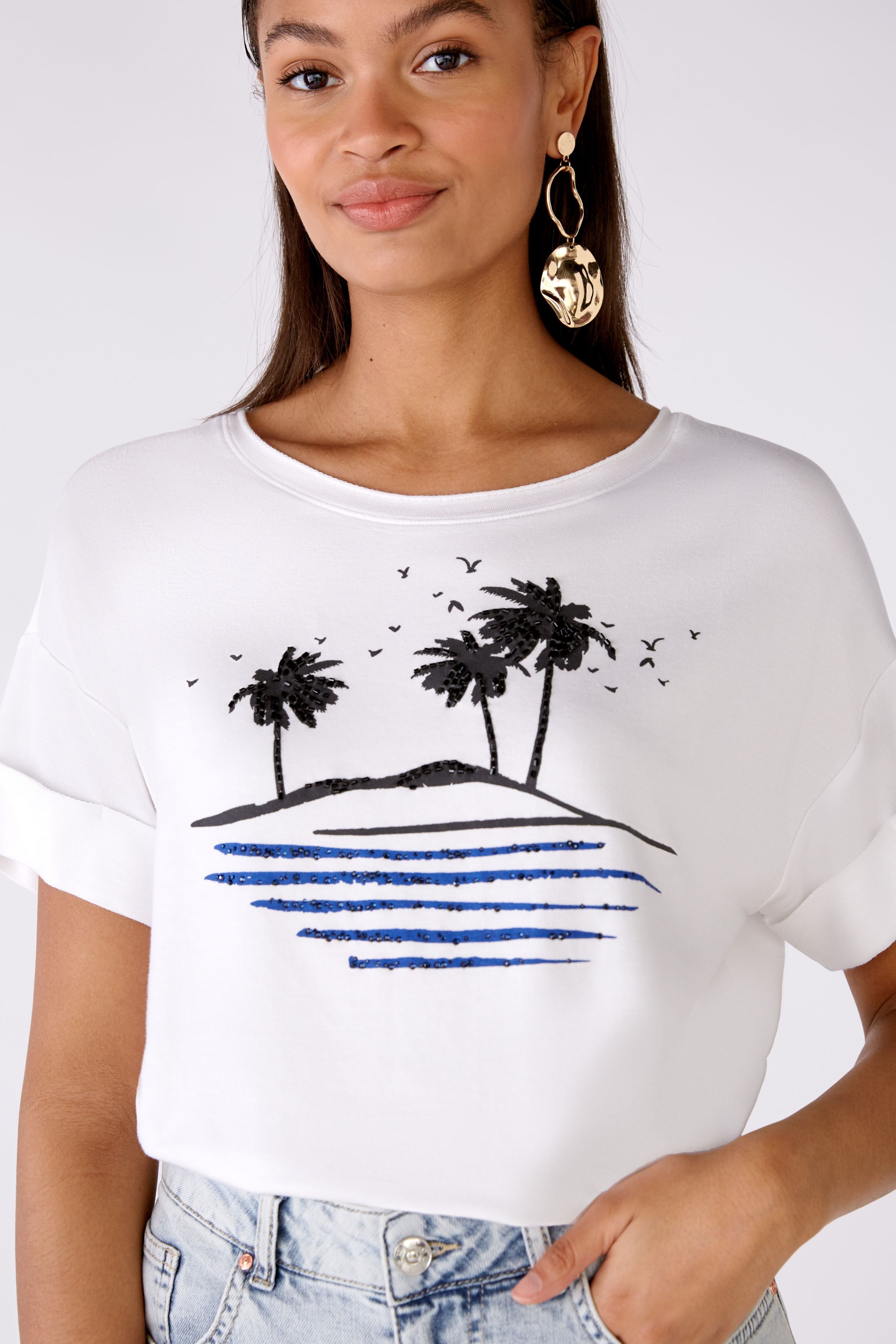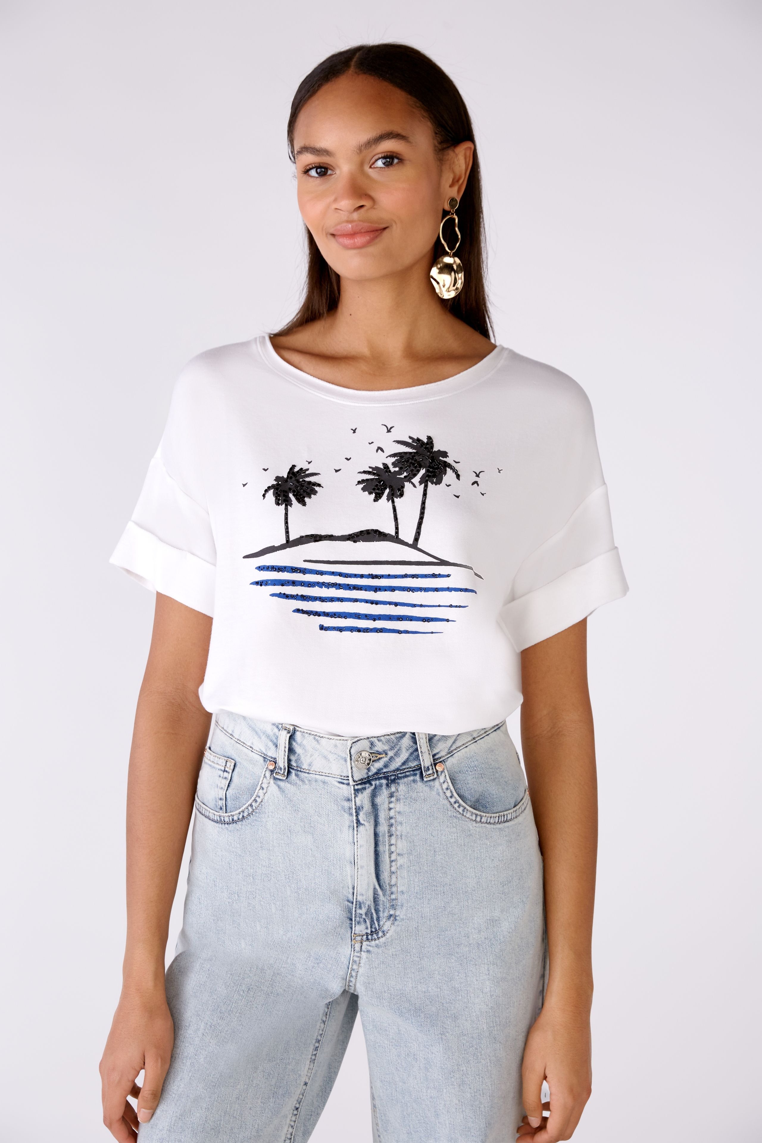 Очень мягкая футболка из смеси хлопка и модала с эластаном. Стильный квадратный фасон, заниженная линия плеч и подвернутые рукава. Обработка краев на вырезе горловины. Стразы тон в тон и тонкая вышивка жемчугом ручной работы. Разрезы по боковому шву. Длина в размере 42: 62 см.