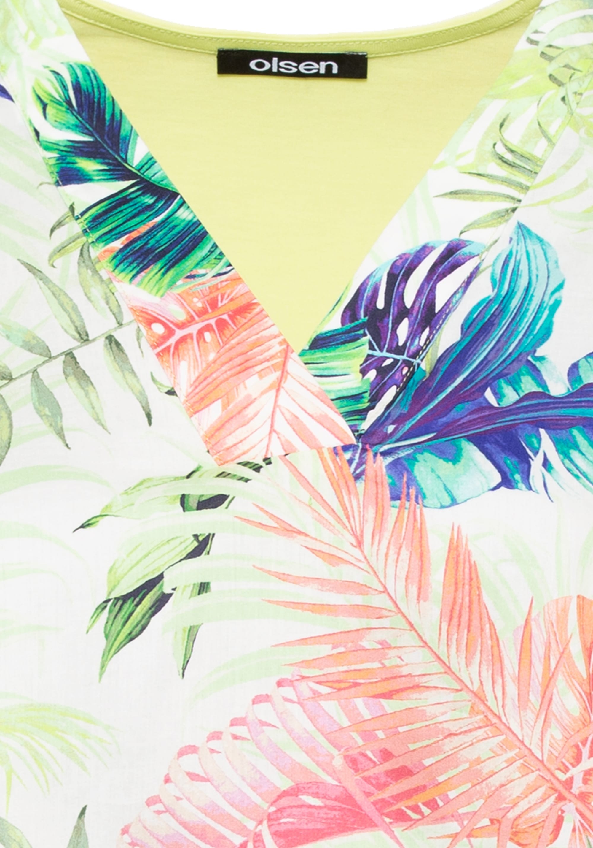 Тропический принт в ярких цветах украшает переднюю часть этой футболки. Вырез туники выполнен спереди из легкого тканого хлопка, а спинка и отделка выполнены из хлопкового трикотажа.