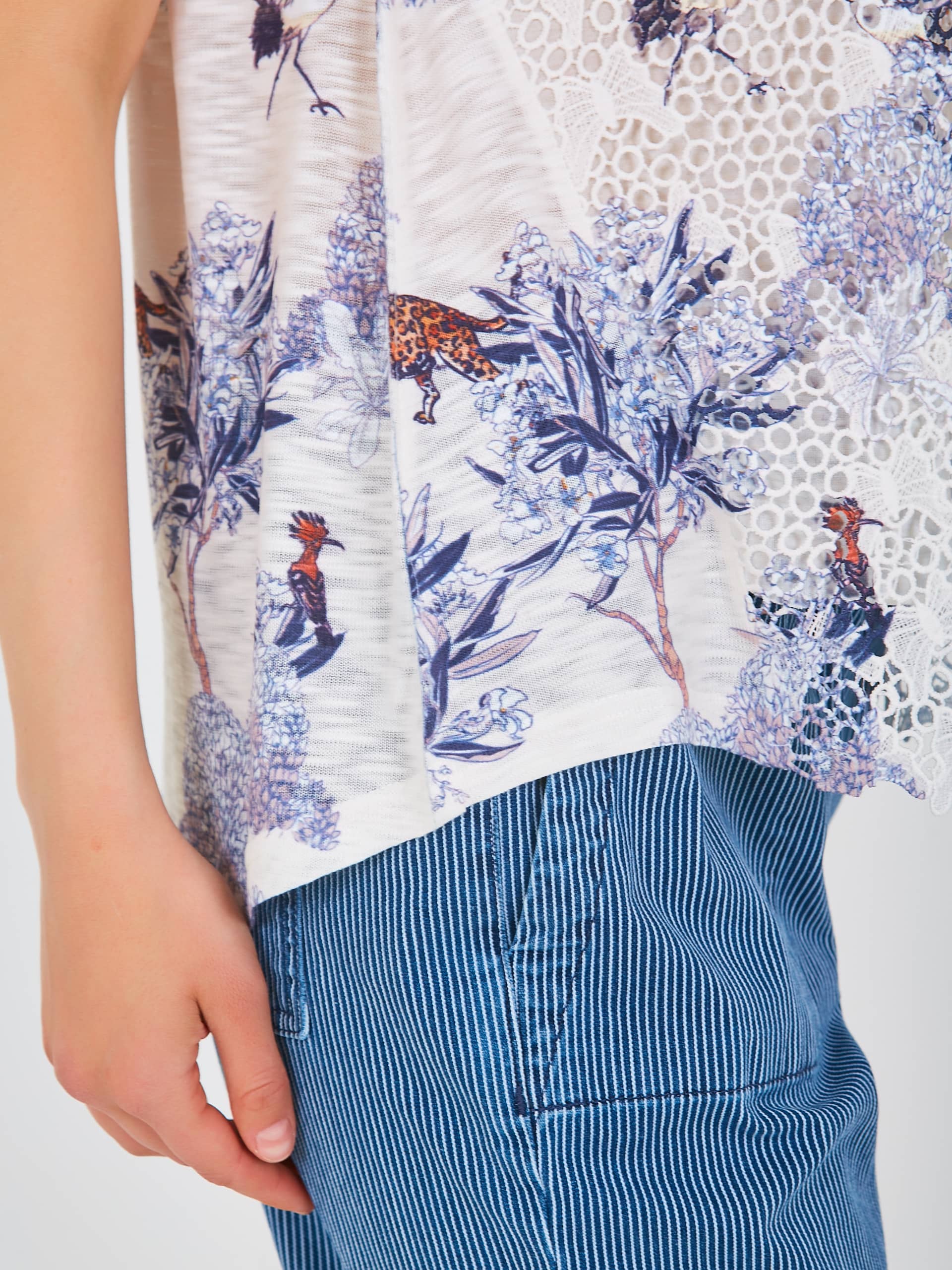 Двухслойная футболка средней длины прямого силуэта из полиэстера с добавлением мягкой вискозы, дизайнерская особенность модели – принт в восточном стиле и фактурный трикотаж. Перед выполнен из нежного шитья с бабочками и вставками из трикотажа. Короткие цельнокроеные рукава с манжетами. Круглый вырез горловины.